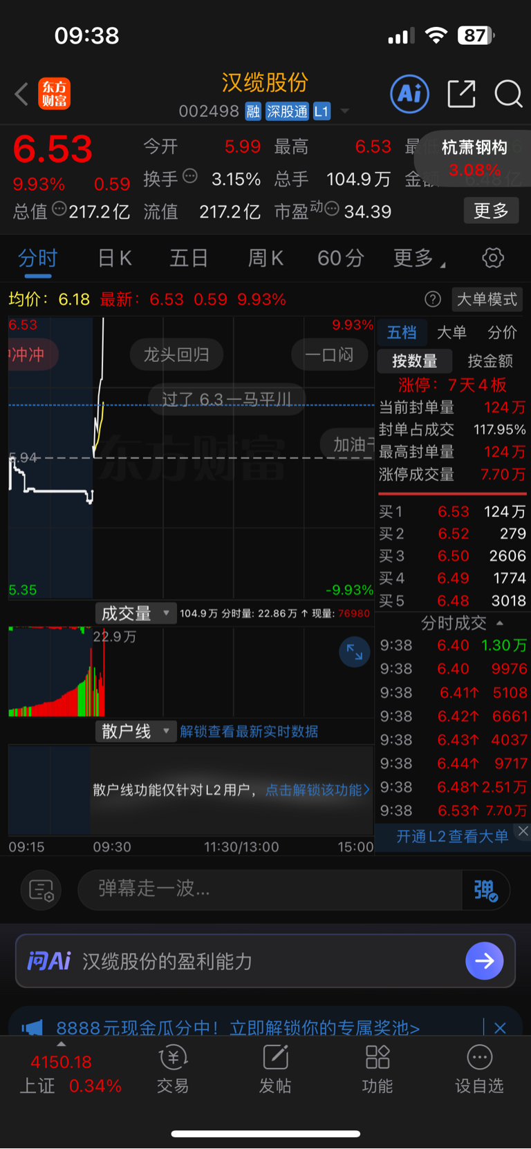$汉缆股份(SZ002498)$ 哈哈,我手快,截到了涨停瞬间的图,刚发出去和朋友说涨停了,回头一看爆头跌到3个点了