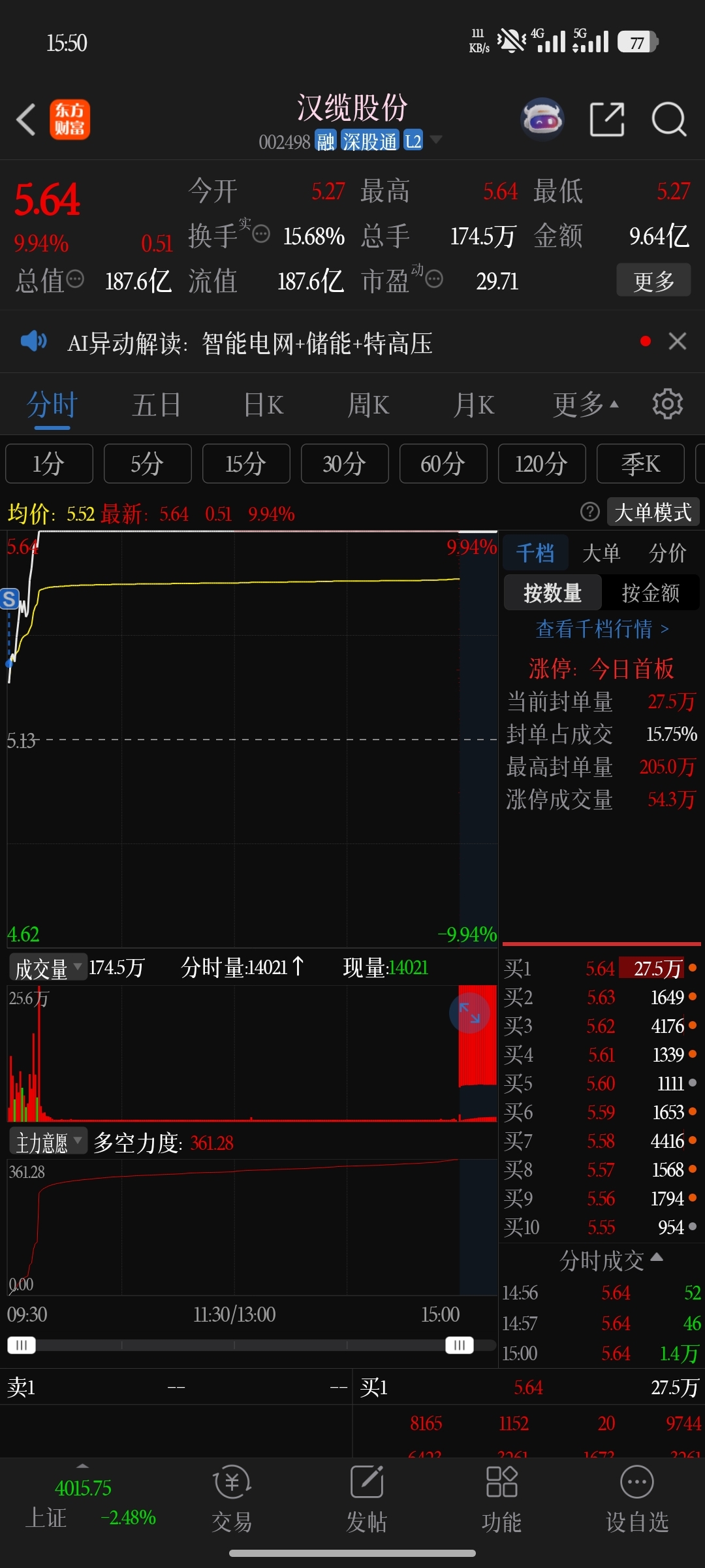 $汉缆股份(SZ002498)$ 他爹的,T飞了