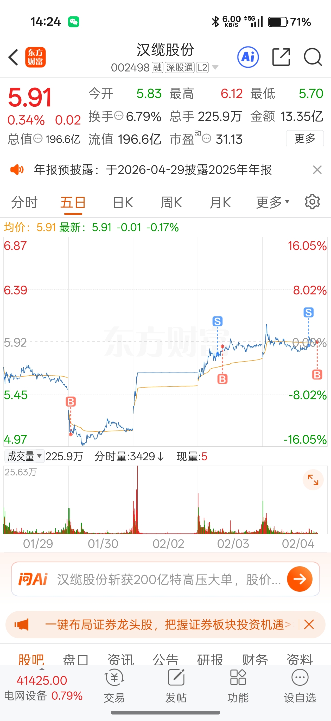 买个股票自己都笑了,还是舍不得汉缆啊