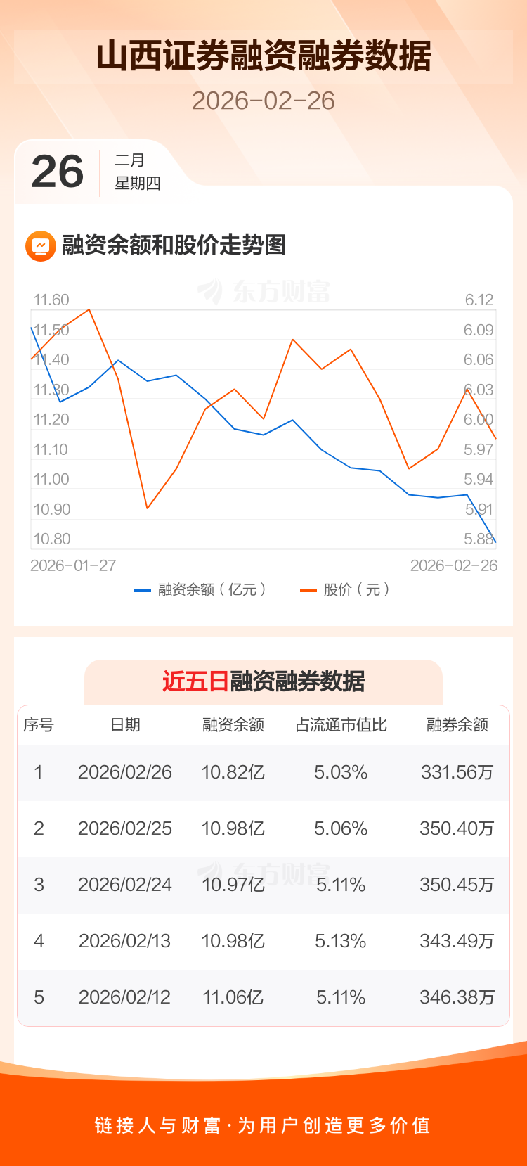 交易所最新数据显示,山西证券于2026年2月26日获融资买入1366.42万元,融资偿还2896.22万元,当日融资净偿还1529.8万元。目前,该股融资余额10.82亿,占流通市值比例为5.03%。