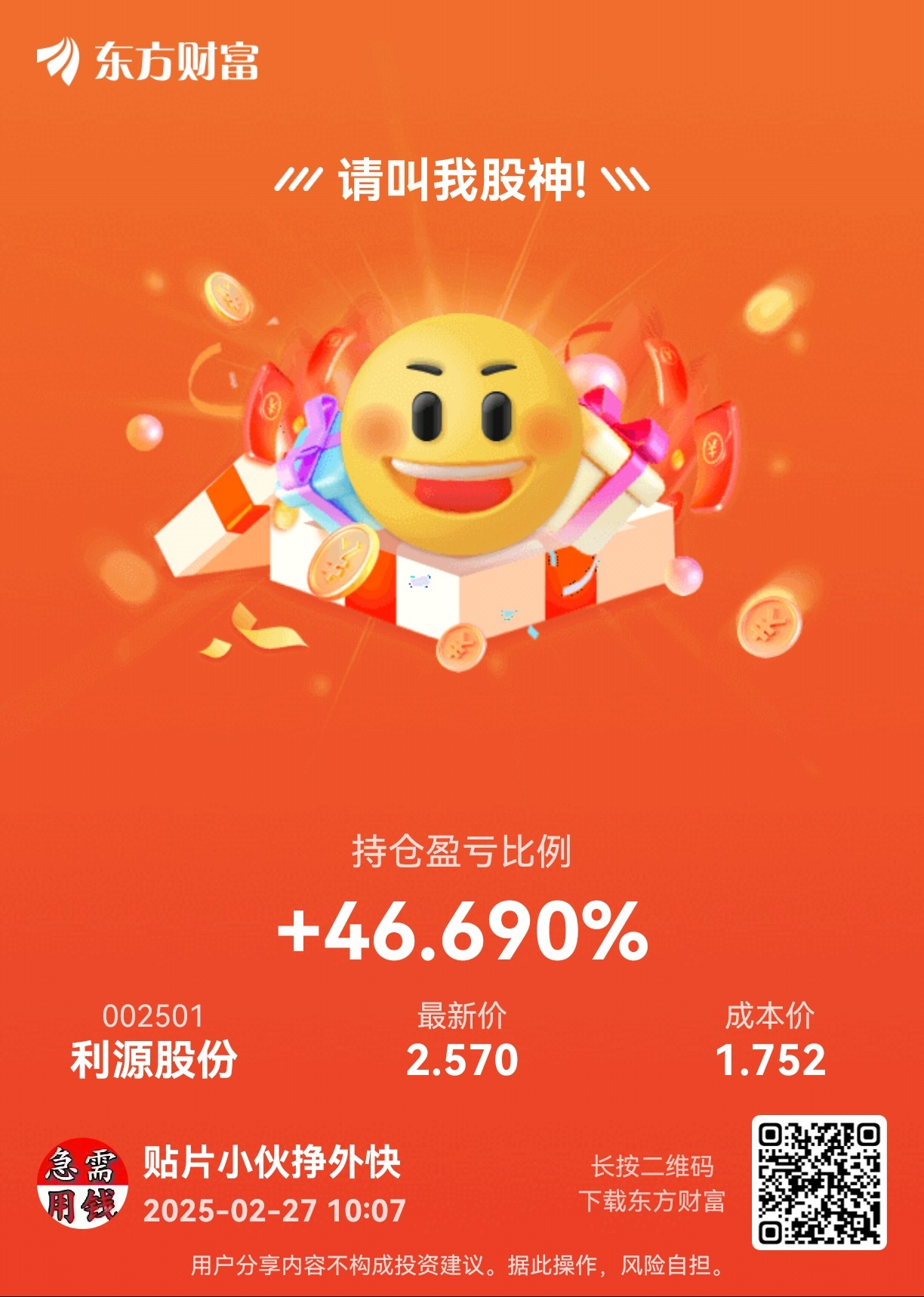 温馨提示: 1.根据《证券法》规定,禁止编造、传播虚假信息或者误导性信息,扰乱证券市场;2.用户在本社区发表的所有资料、言论等仅代表个人观点,与本网站立场无关,不对您构成任何投资建议。用户应基于自己的独立判断,自行决定证券投资并承担相应风险。《东方财富社区管理规定》