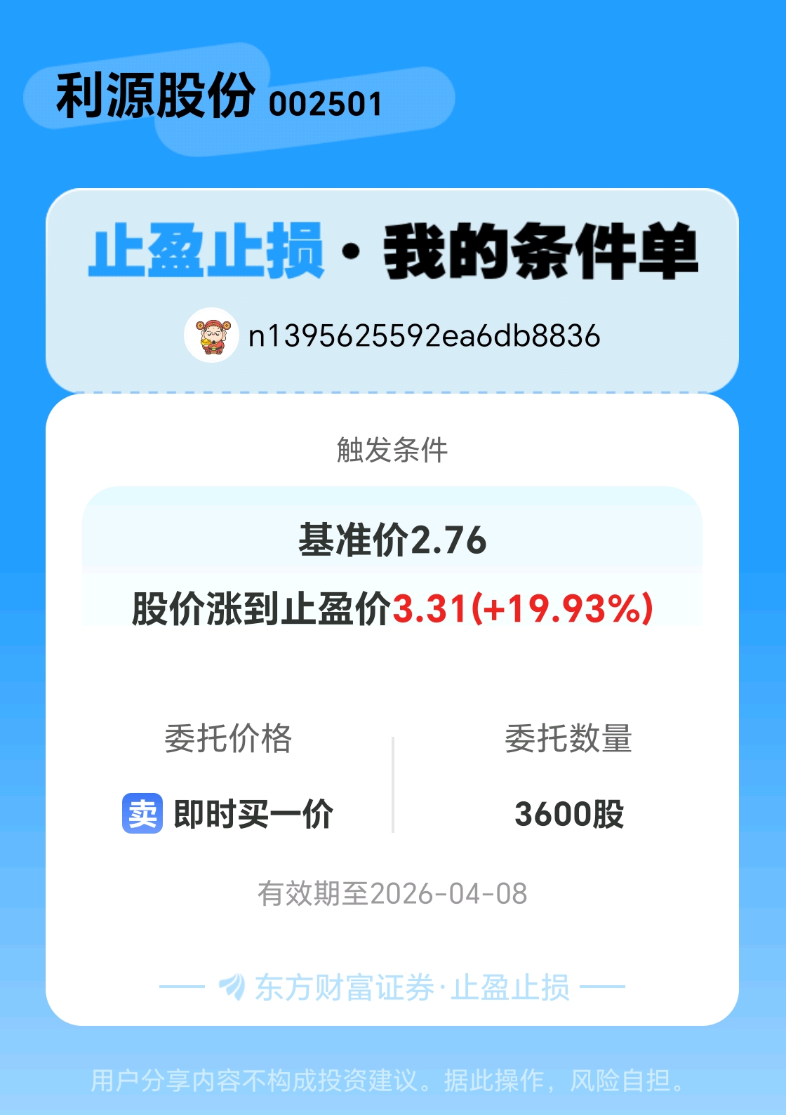 #条件单交流# #止盈止损晒单# 一位股神设置了一个止盈止损条件单,接下来就是见证奇迹的时刻~$利源股份(SZ002501)$