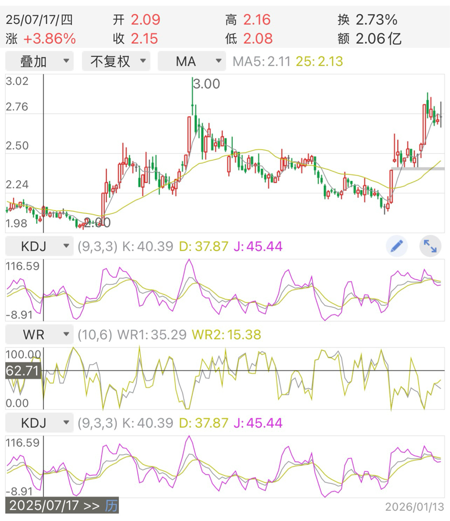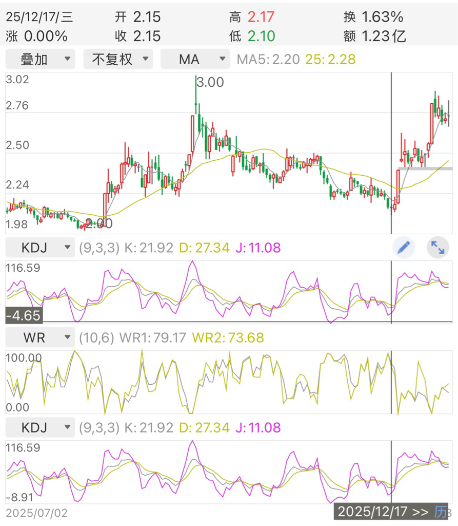 如图所示,利源股份2025年7月17日—12月17日这五个月,从2.15元—2.