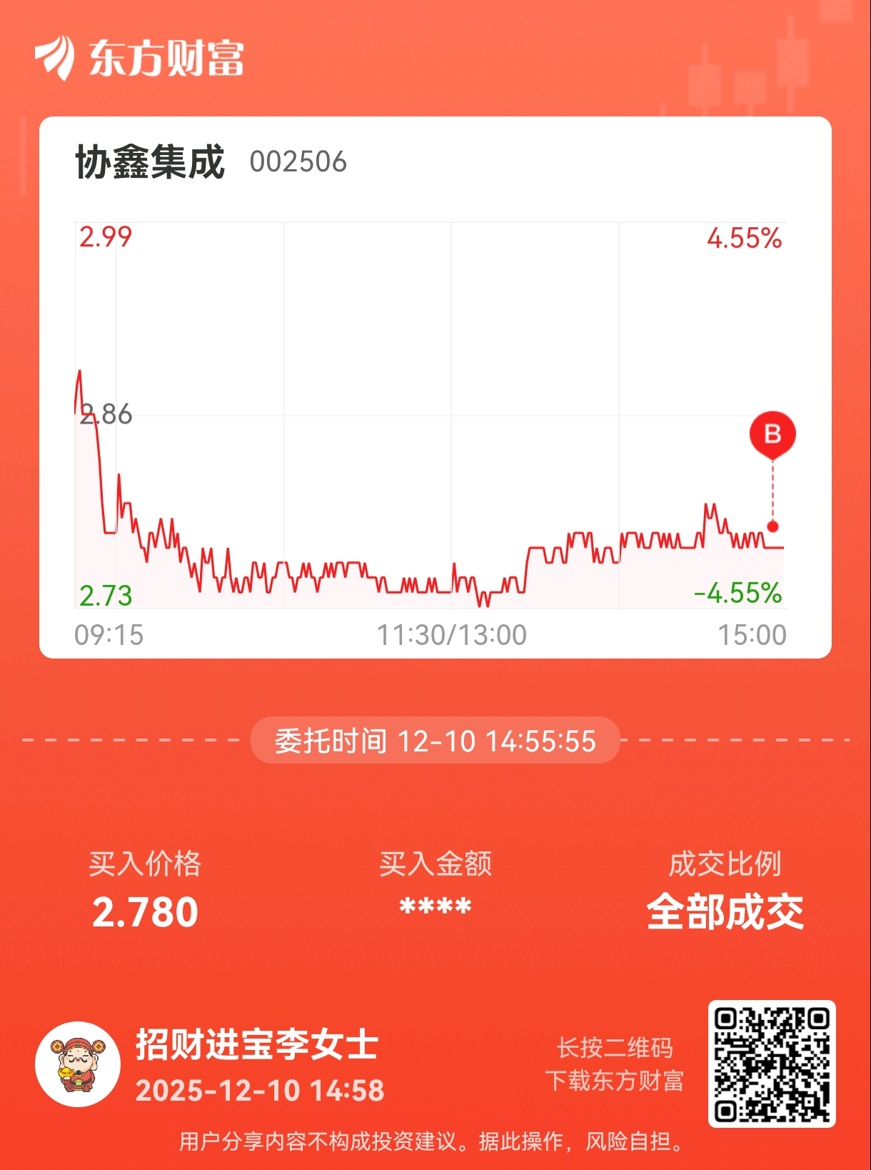 温馨提示: 1.根据《证券法》规定,禁止编造、传播虚假信息或者误导性信息,扰乱证券市场;2.用户在本社区发表的所有资料、言论等仅代表个人观点,与本网站立场无关,不对您构成任何投资建议。用户应基于自己的独立判断,自行决定证券投资并承担相应风险。《东方财富社区管理规定》