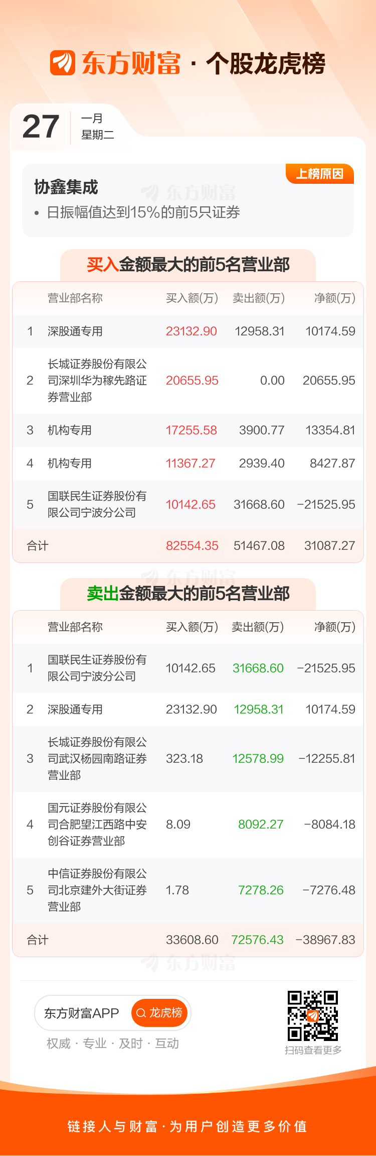 交易所2026年1月27日公布的交易公开信息显示,协鑫集成因成为日振幅值达到15%的前5只证券上榜。协鑫集成当日收报3.69元,涨跌幅6.96%,偏离值18.01%,换手率28.28%,成交额57.92亿。