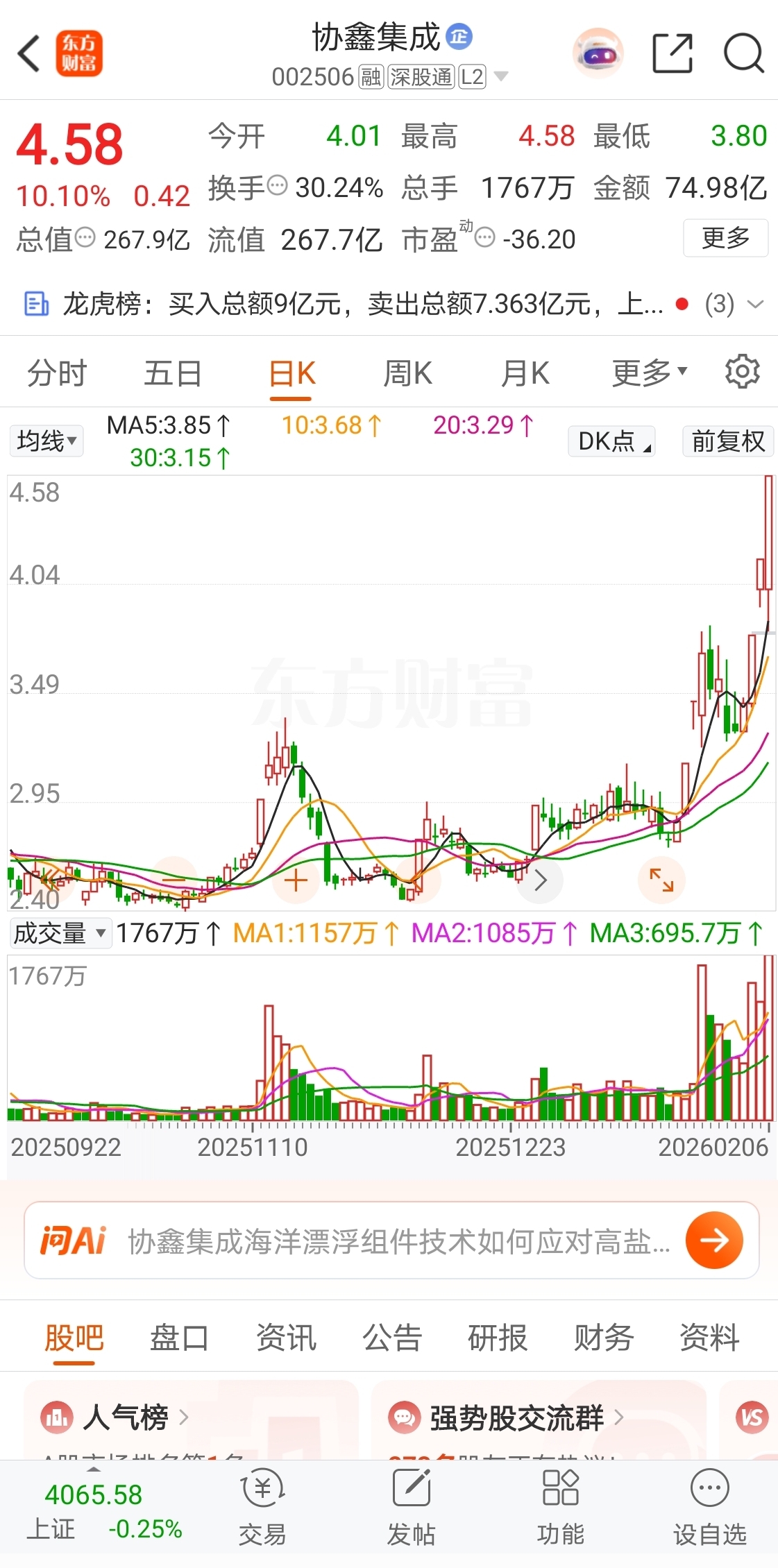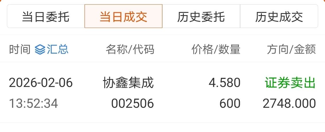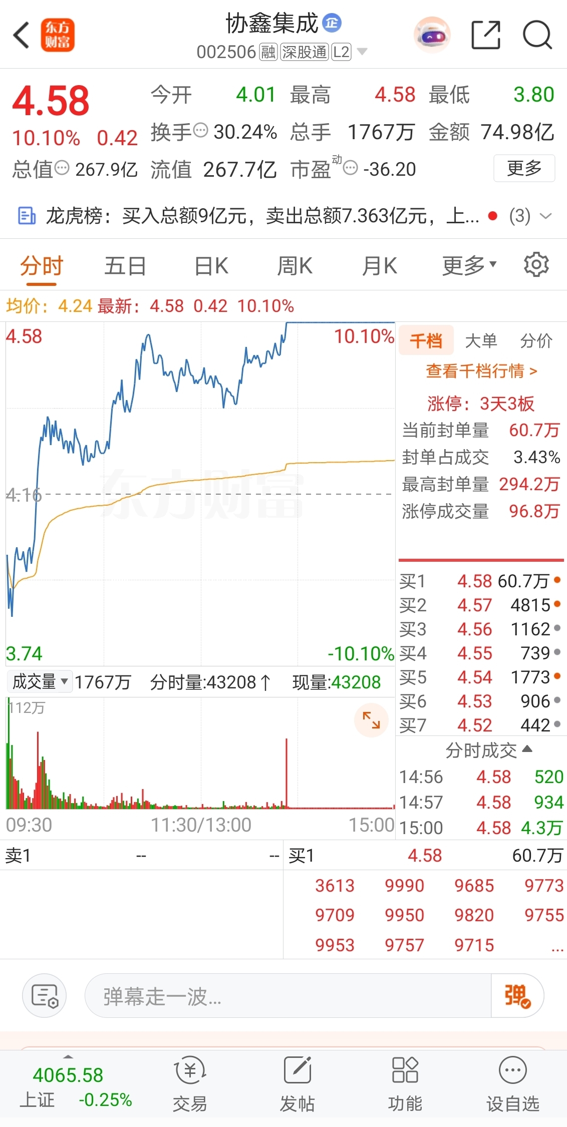 2026-02-06协鑫集成三连板涨停,选择在第3个涨停板,涨停价格4.58元卖