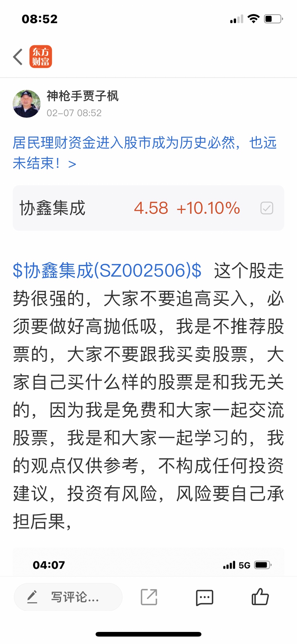 温馨提示: 1.根据《证券法》规定,禁止编造、传播虚假信息或者误导性信息,扰乱证券市场;2.用户在本社区发表的所有资料、言论等仅代表个人观点,与本网站立场无关,不对您构成任何投资建议。用户应基于自己的独立判断,自行决定证券投资并承担相应风险。《东方财富社区管理规定》