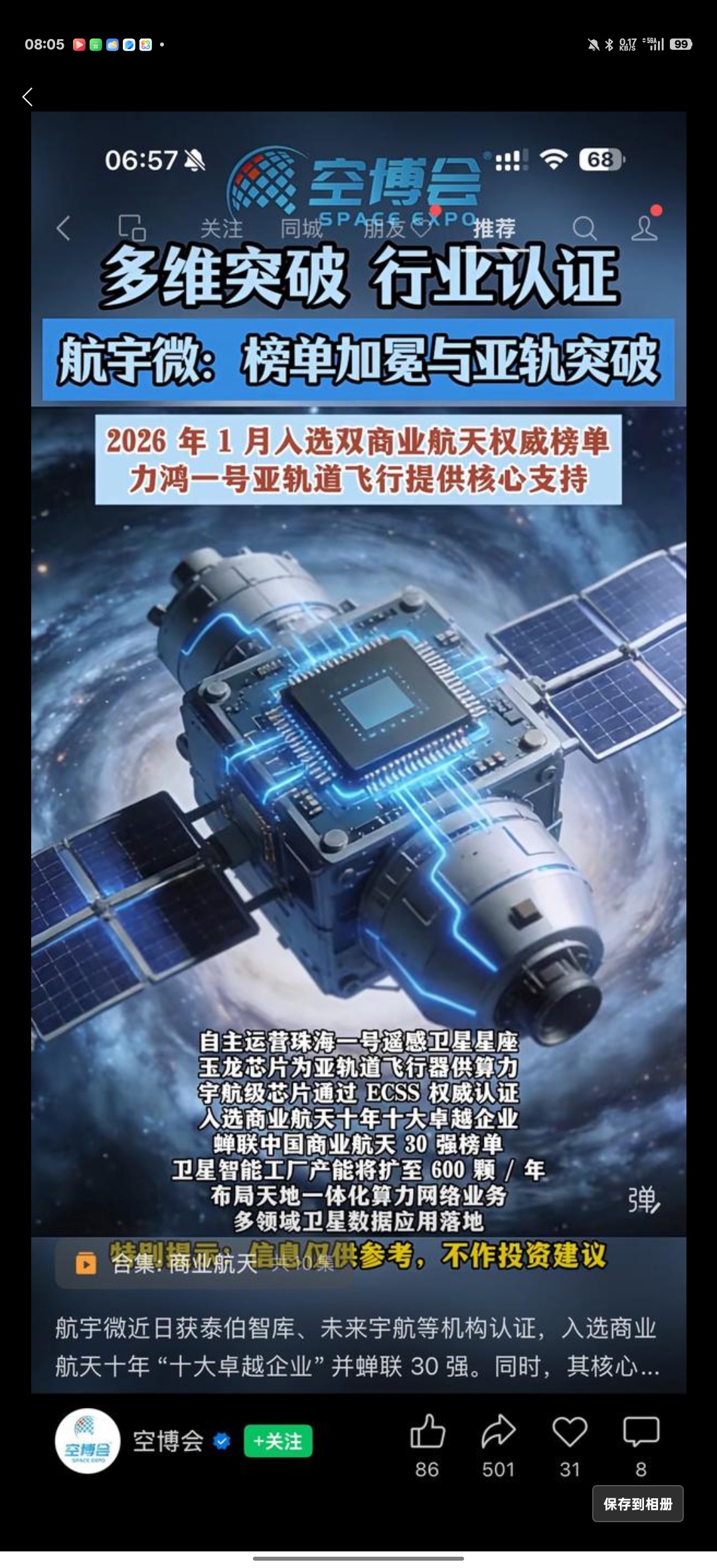 “力鸿一号” 亚轨道飞行器提供算力支持,自主运营 “珠海一号” 星座,芯片业务通过国际认证,卫星产能与算力布局稳步推进。(特别提示:信息仅供参考,不作投资建议)#空博会企业巡礼 #航宇微 #珠海一号 #力鸿一号 #玉龙芯片 #商业航天榜单 #亚轨道飞行 @空博会