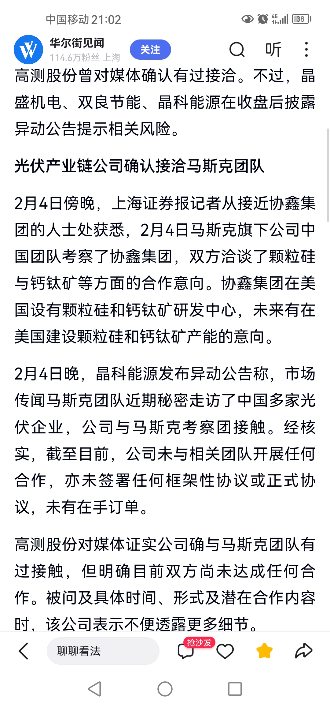 协鑫集成必然10倍:1,上证报道协鑫集成已与马斯克签订了在美建钙钛矿产能的意向;2,马斯克最新发言,真正重要的是发电效率与产量,而不是美元。