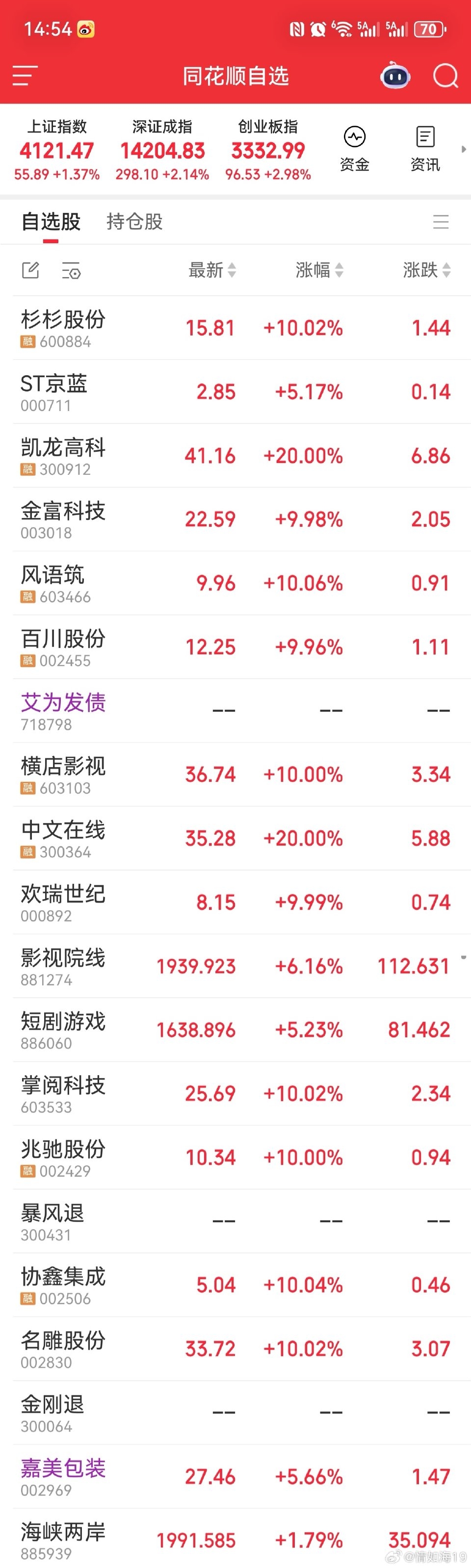 [给力]2.单点3天京蓝、凯龙高科、金富科技、杉杉、风语筑、百川股份(名雕股份、协鑫集成)。3.影视短剧:单点3天横店影视(中文在线,欢瑞世纪),恭喜吃肉。收工。