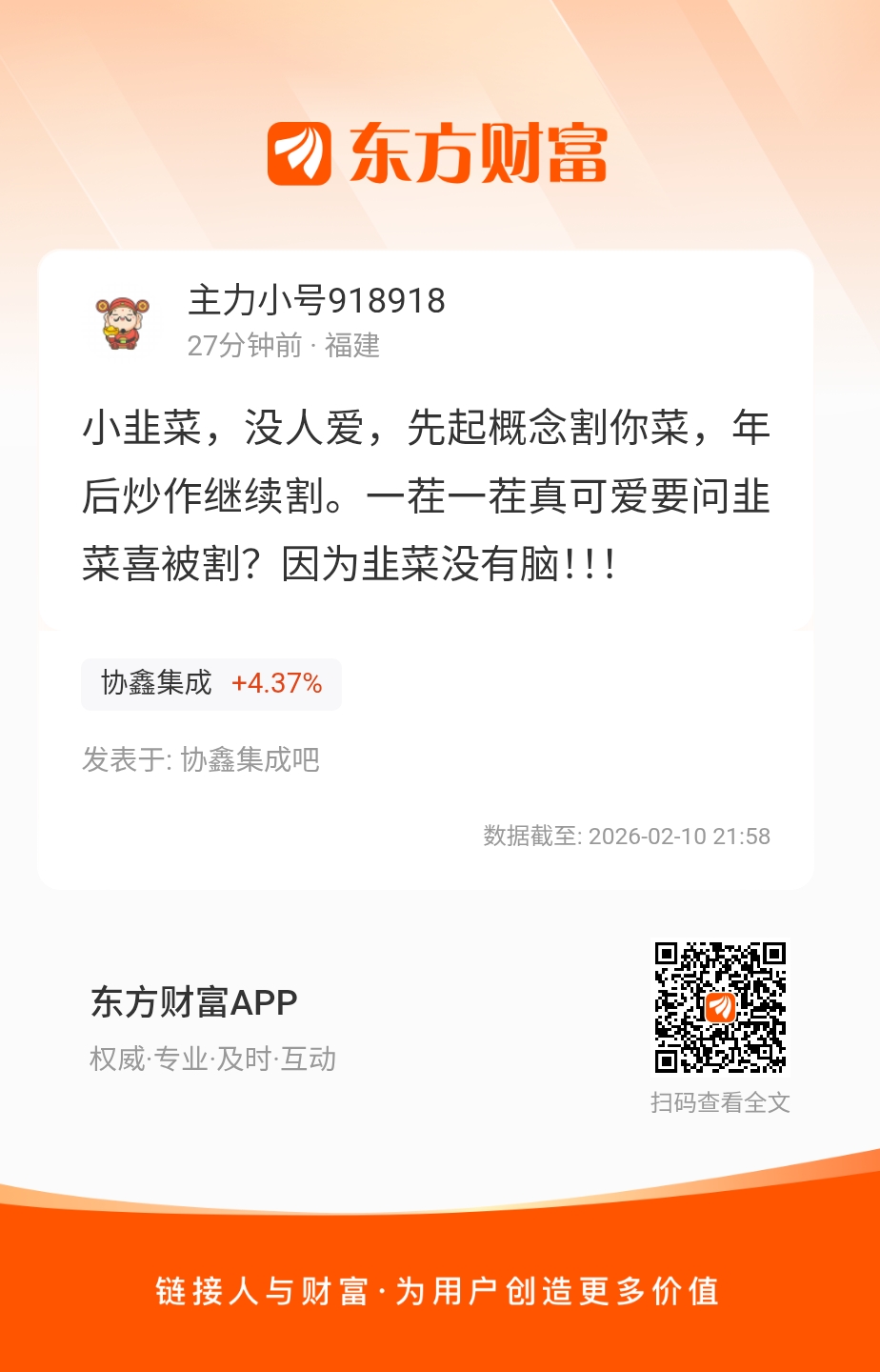 温馨提示: 1.根据《证券法》规定,禁止编造、传播虚假信息或者误导性信息,扰乱证券市场;2.用户在本社区发表的所有资料、言论等仅代表个人观点,与本网站立场无关,不对您构成任何投资建议。用户应基于自己的独立判断,自行决定证券投资并承担相应风险。《东方财富社区管理规定》