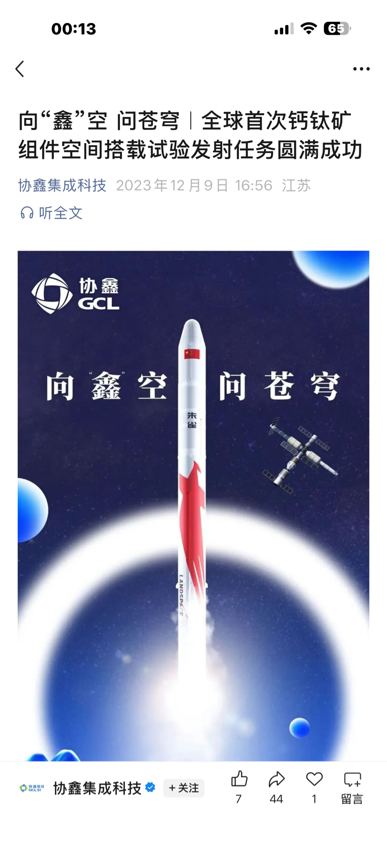 $协鑫集成(SZ002506)$ 来自协鑫集成微信公众号,23年12月9日就上太空了