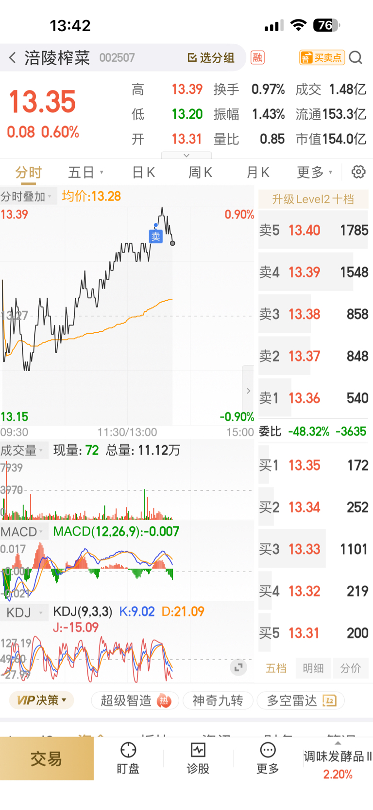 $涪陵榨菜(SZ002507)$ 卖完了,好慌啊,13以下的命