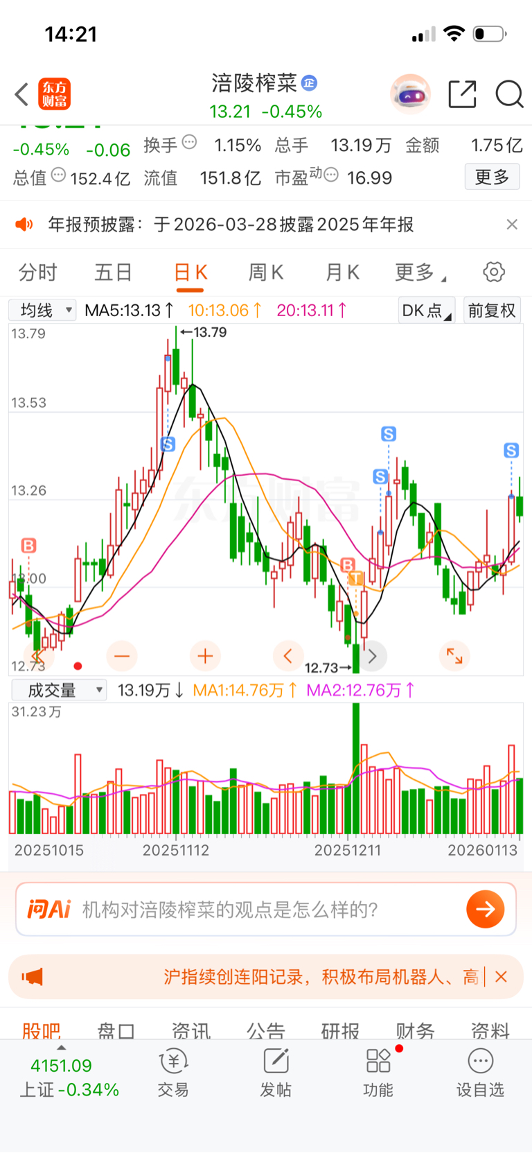 $涪陵榨菜(SZ002507)$ 这票挺适合反复做 T,在低位 ,即使 T 不出去就拿手里向下没多少空间,13 以下就进货,13 以上就出
