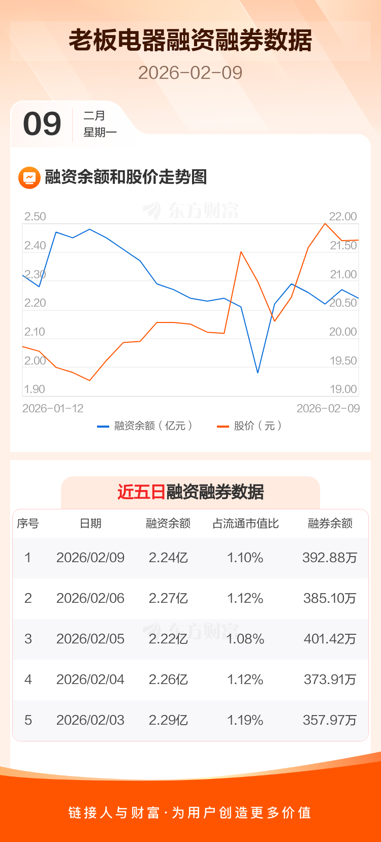 交易所最新数据显示,老板电器于2026年2月9日获融资买入1223.07万元,融资偿还1518.68万元,当日融资净偿还295.61万元。目前,该股融资余额2.24亿,占流通市值比例为1.10%。
