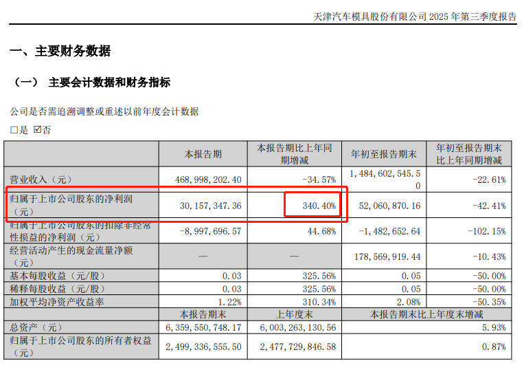 天汽模的第三季度业绩利润3000多万,同比去年增长340%!