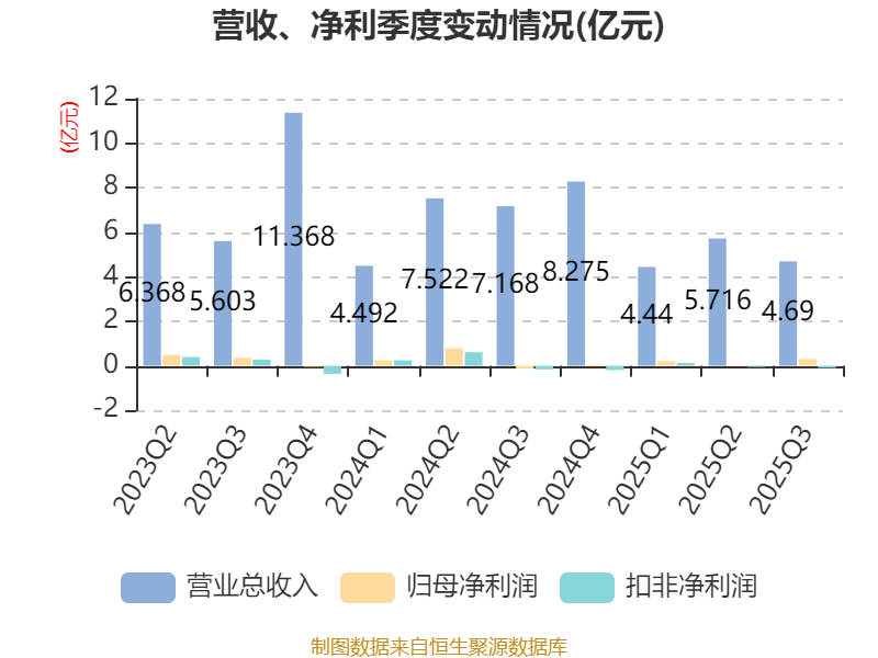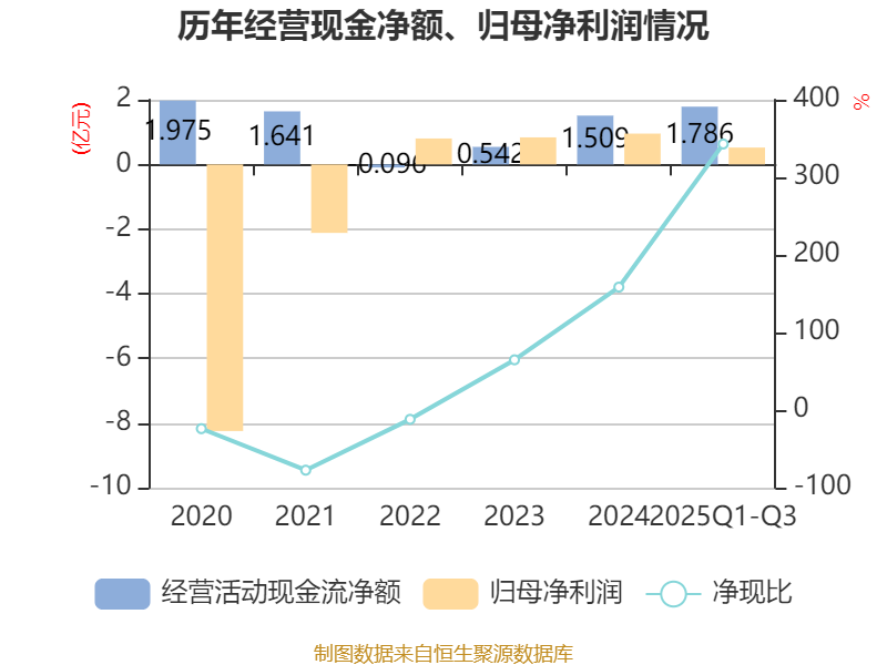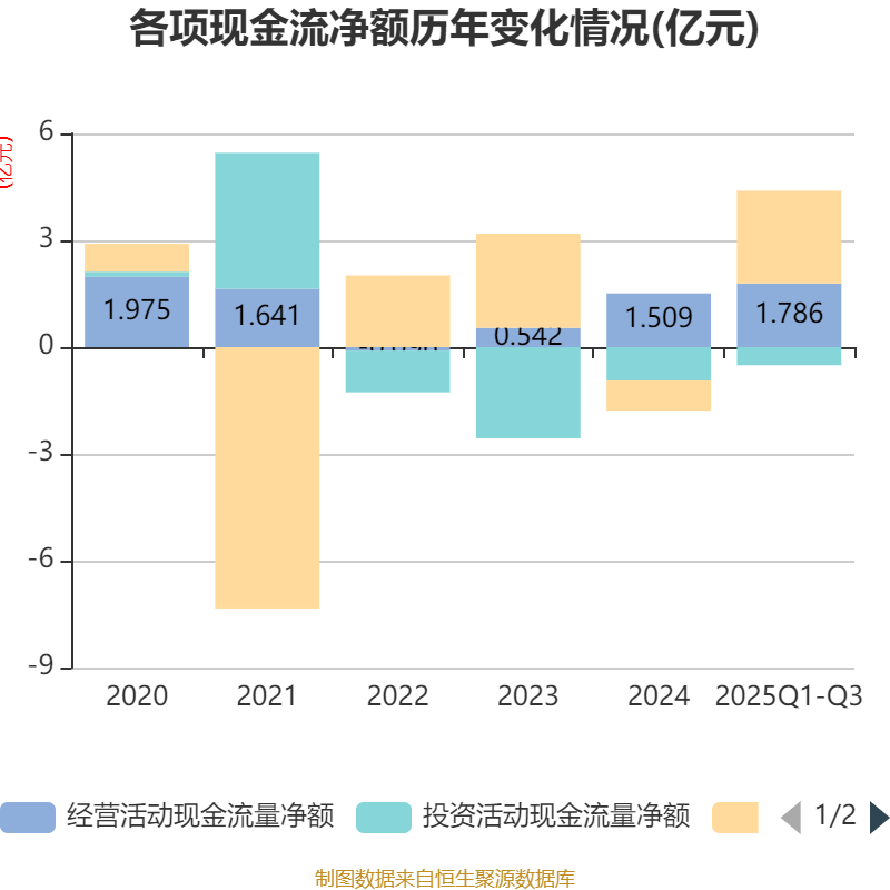 2025年前三季度,公司经营活动现金流净额为1.79亿元,同比下降10.43%;筹资活动现金流净额2.61亿元,同比增加2.55亿元;投资活动现金流净额-5084.73万元,上年同期为-3780.87万元。
