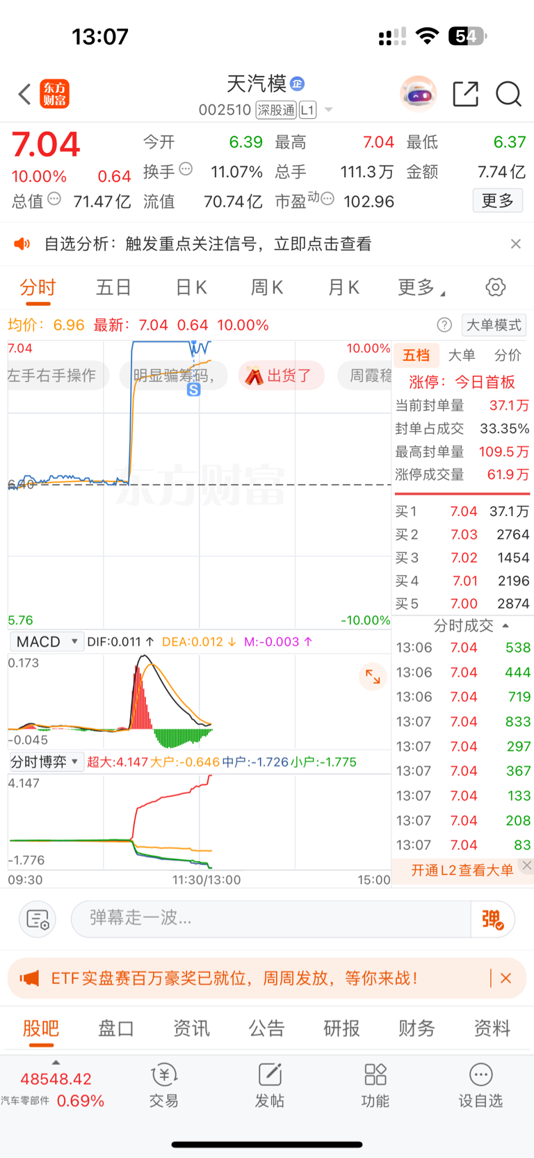 $天汽模(SZ002510)$ 出喽#复盘记录# #炒股日记# #强势机会# #股市怎么看# #实盘记录#