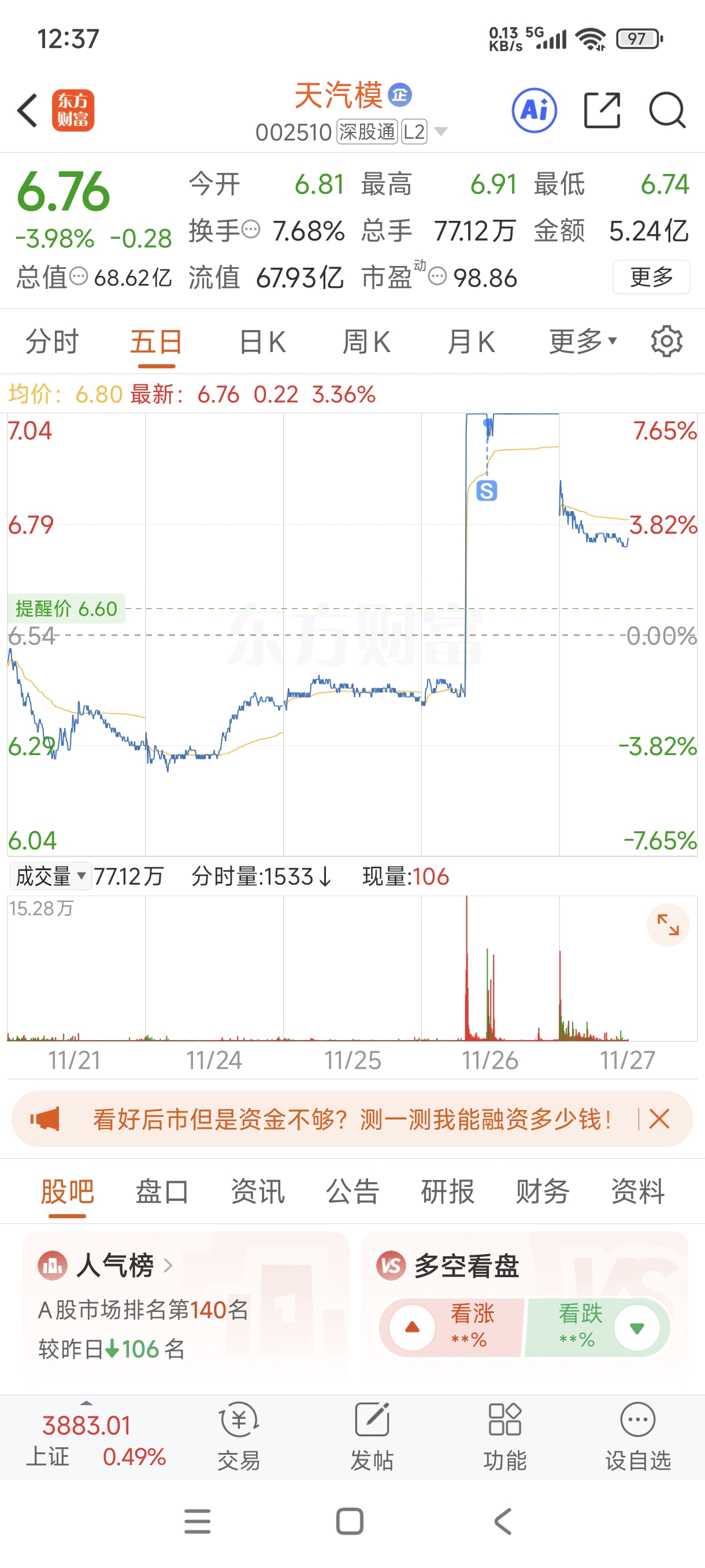 $天汽模(SZ002510)$ 6.60左右能接回来吗?