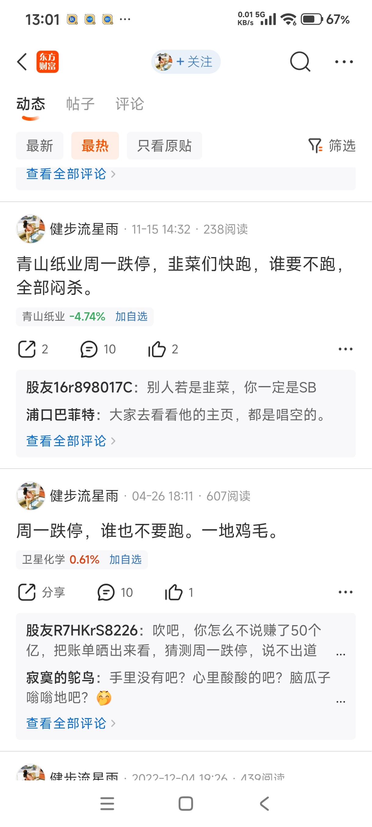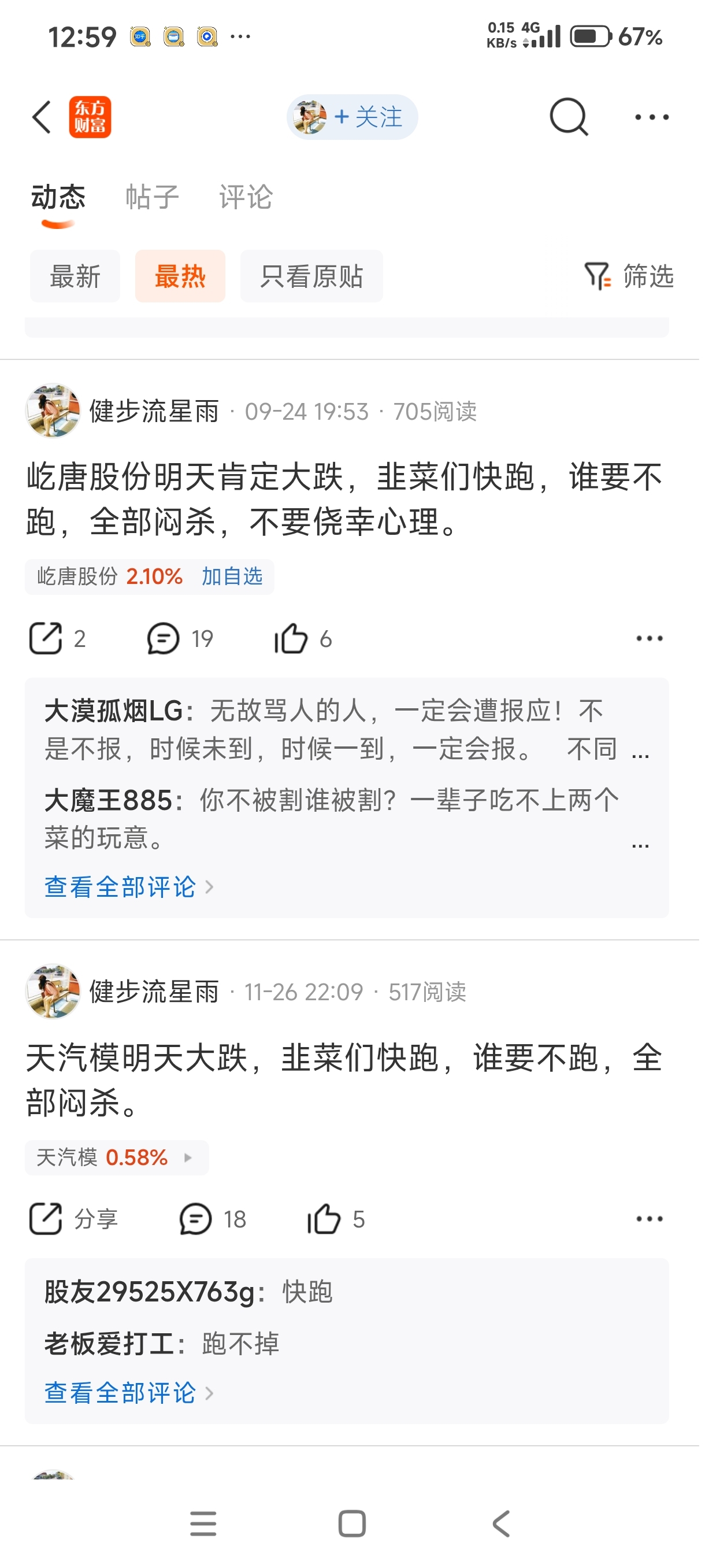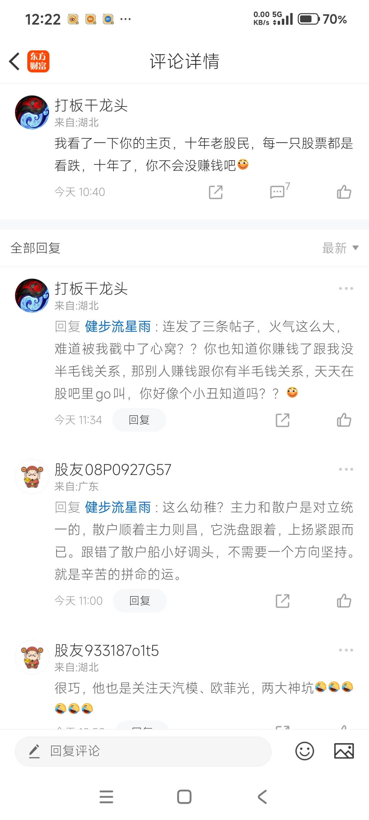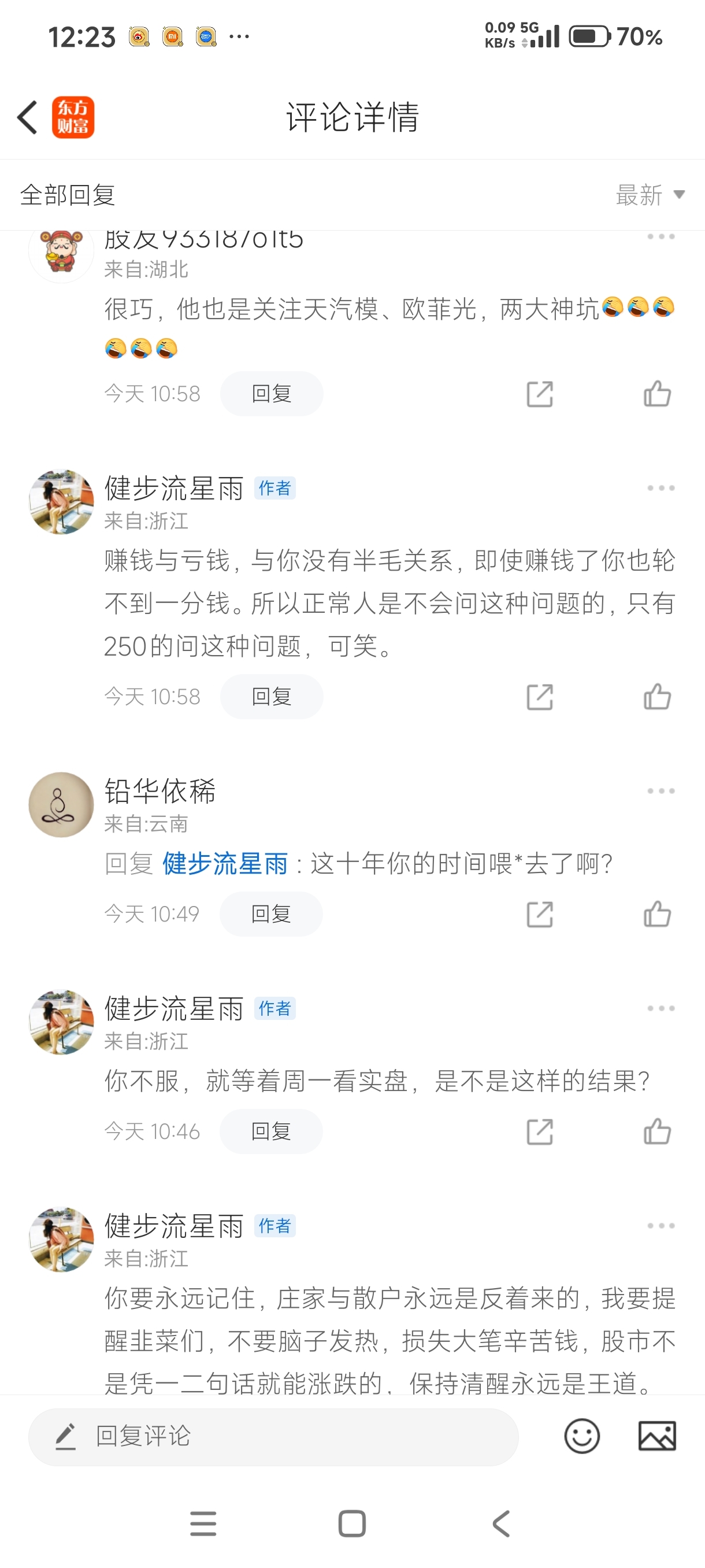 $天汽模(SZ002510)$ 股吧里那个叫健步流星雨的人,各位兄弟请看他的主页,他是十年老韭菜,每个票都在唱空,我问他十年是不是至今未赚钱,他说跟我没关系,还骂我250,然后我说,那别人赚不赚钱又跟你没关系,天天在股吧里go叫干啥,他又不说话了,下次你们发帖子,他再go叫,你们应该知道怎么说了吧