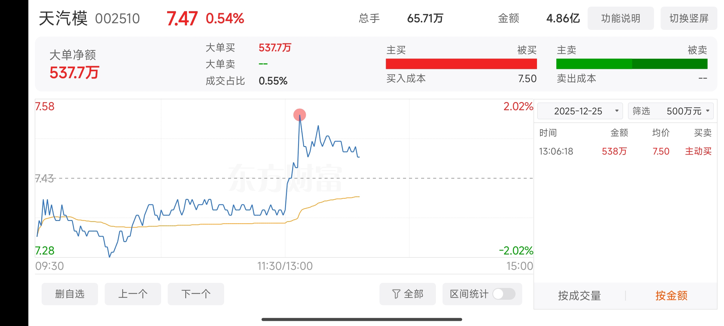 $天汽模(SZ002510)$ 500万挂山顶上了