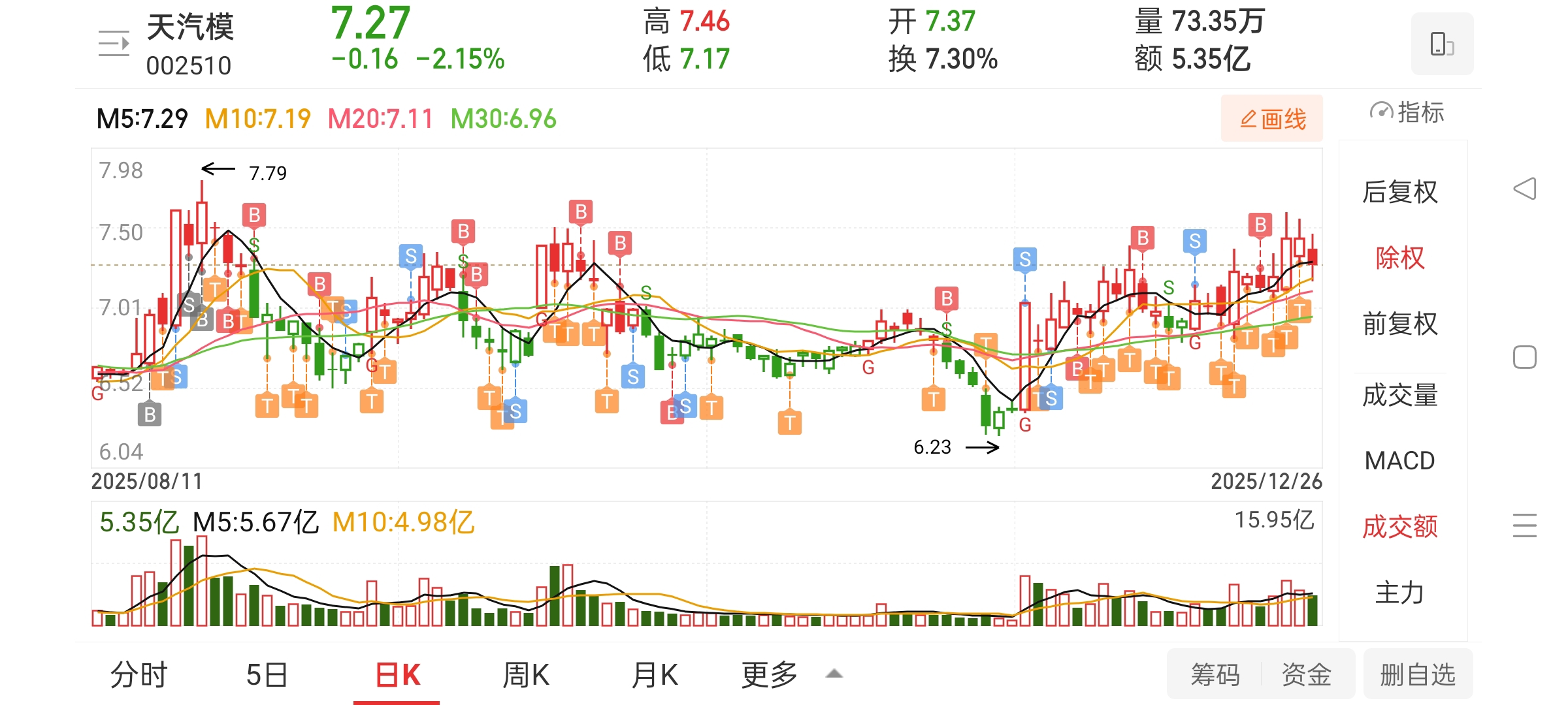 $天汽模(SZ002510)$ 这个票我是8月份7.68元进的,现在成本7块,要挣钱就是得做t,要比量化卖的快,不要怕卖飞,总会有倒车接人的机会,以目前的时间节点来看,估计还得磨,跟主力量化一起做t