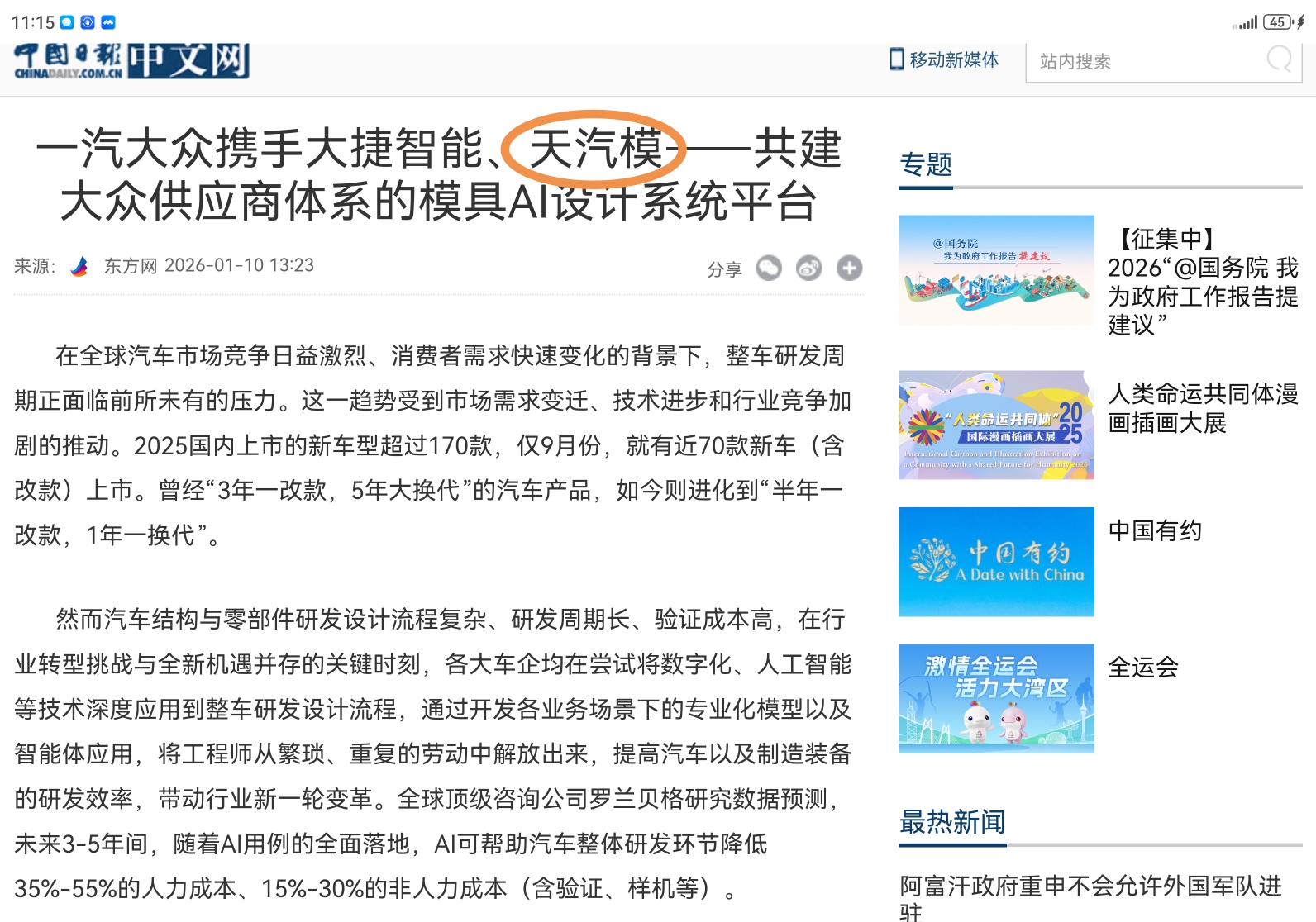 $天汽模(SZ002510)$ $人工智能ETF易方达(SZ159819)$ 一汽大众携手大捷智能、天汽模——共建大众供应商体系的模具AI设计系统平台!天汽模是AI+汽车模具设计的龙头应用!