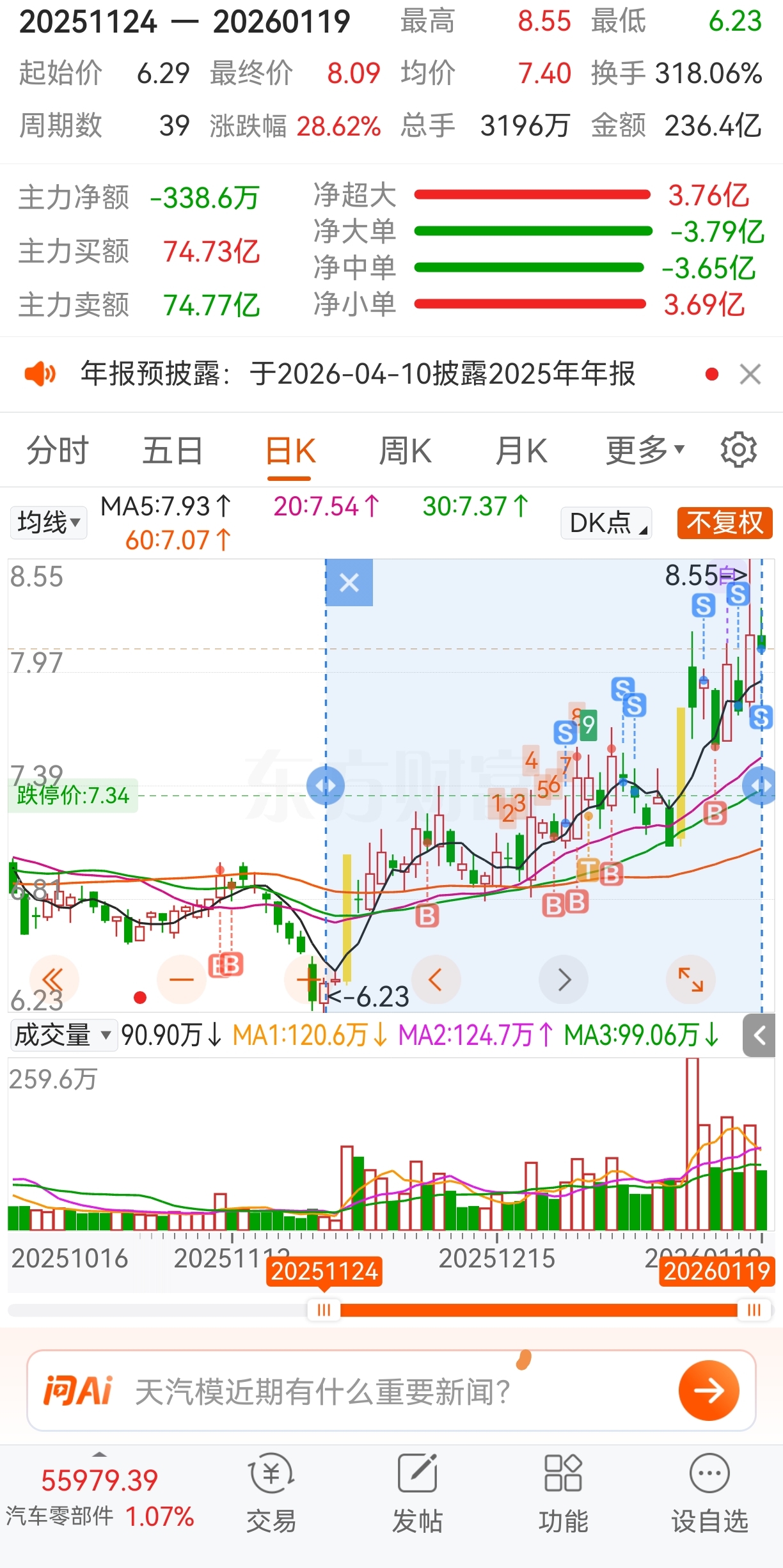 看到大家都在,我在这胡说八道两句,39个交易日涨幅近30,如果没什么消息理应回踩