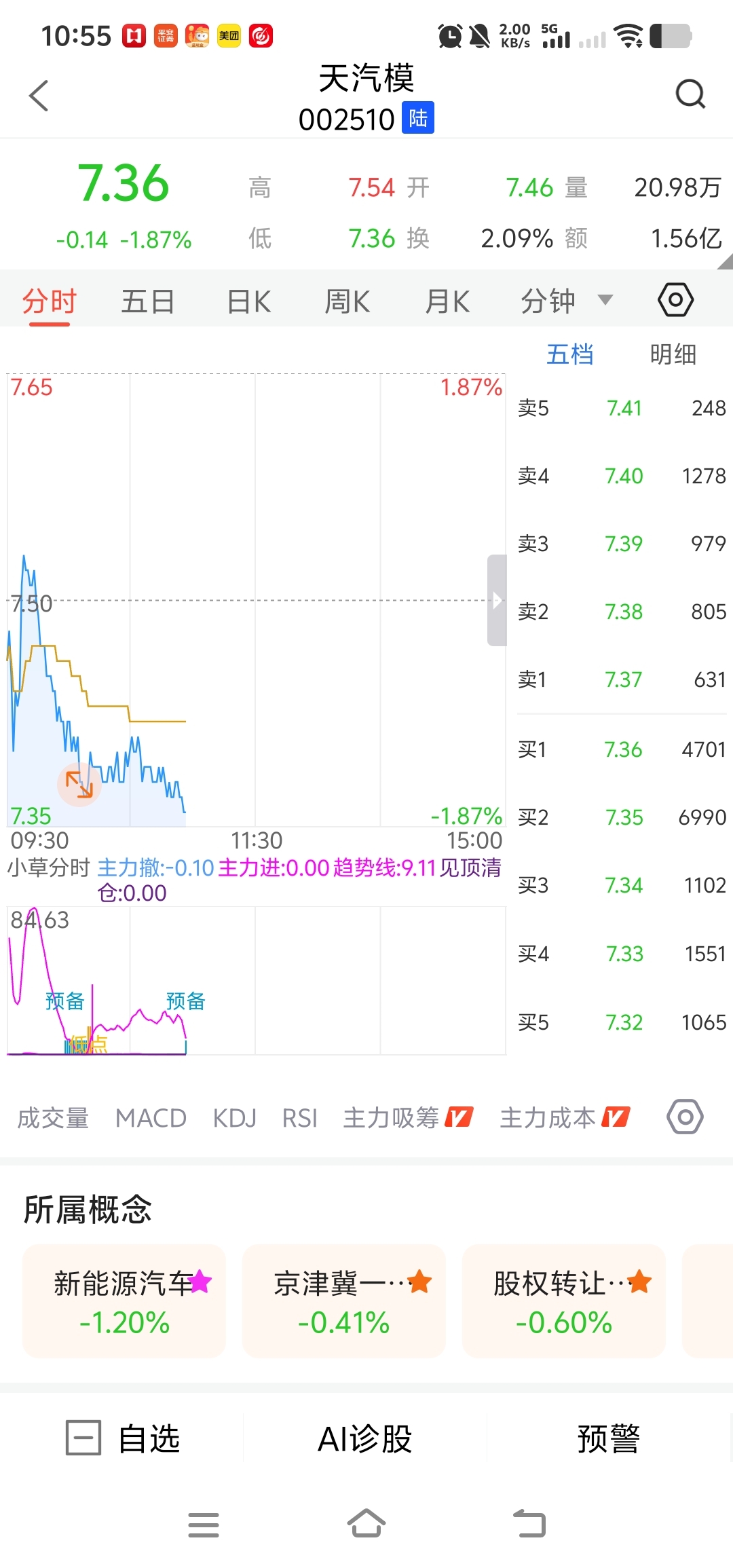$天汽模(SZ002510)$ 今天的双底起码7.36不会亏