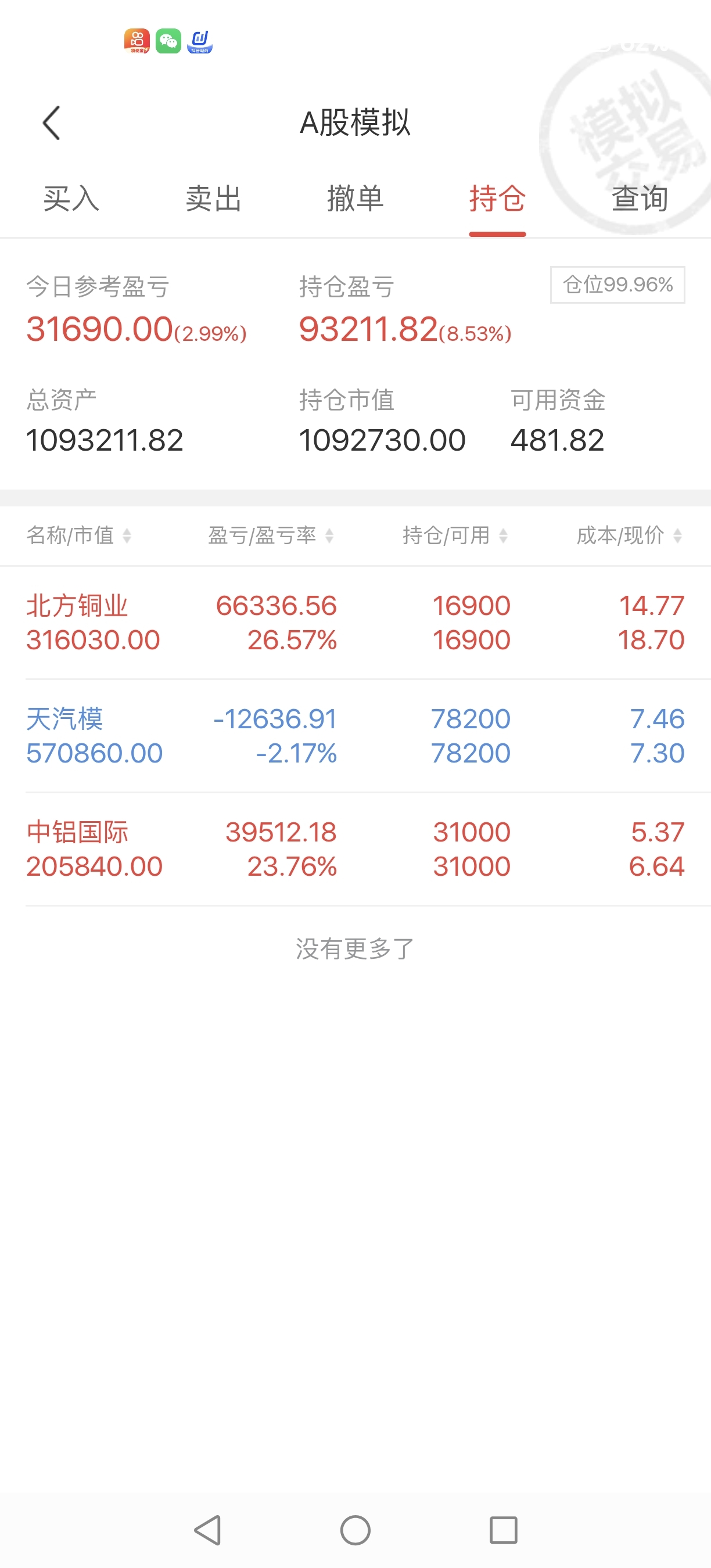 $天汽模(SZ002510)$ 同一天买入的模拟仓,重仓天汽模,马上三十个点的差距了