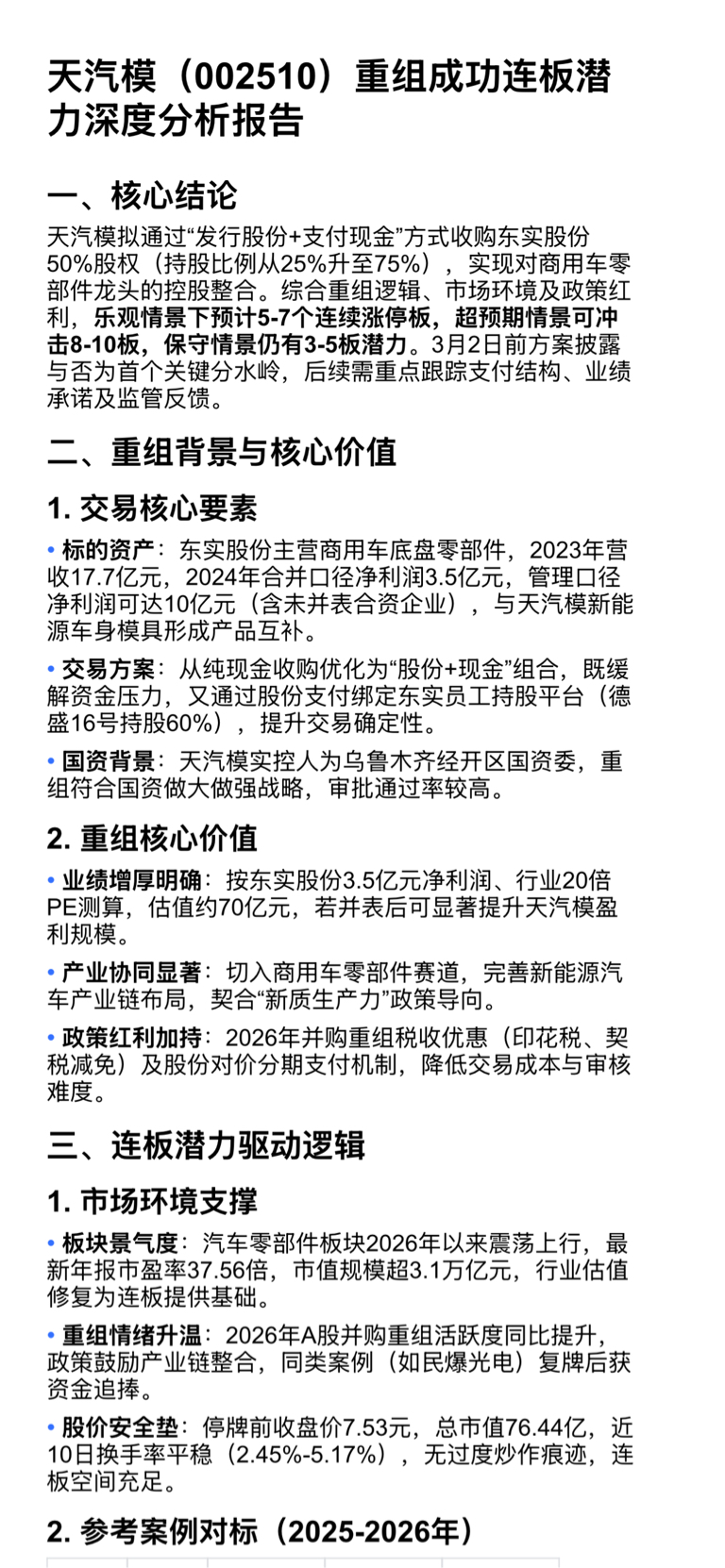 $天汽模(SZ002510)$ 都在猜想有多少板,根据对称理论,如果重组成功,我个人保守估计5-6板!各位还是看看豆包的综合分析吧!