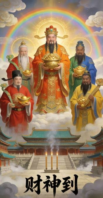 天门开,地门开,五路财神进门来。一赐福,二赐财,赐来金银抱满怀。三赐吉,四赐祥,