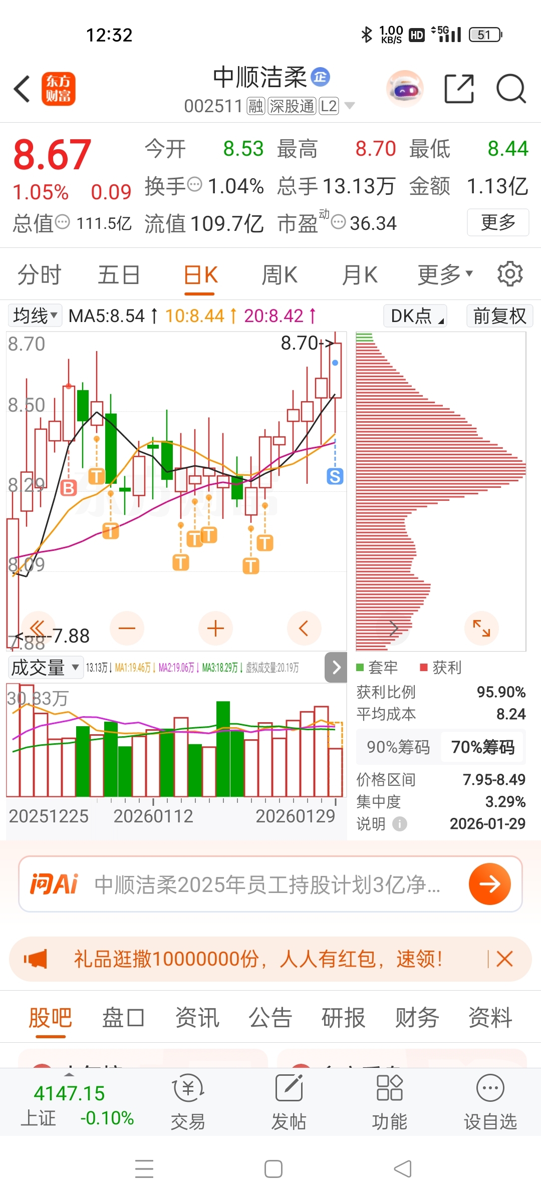 $中顺洁柔(SZ002511)$ 好股哈哈走了你慢慢涨吧