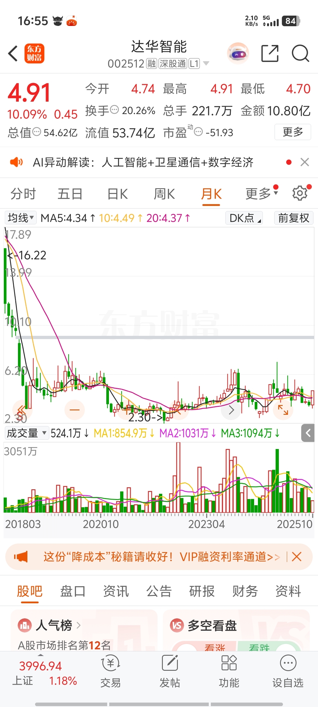 $达华智能(SZ002512)$ 这个票真有点龙头像啊,月线太漂亮。横有多长,竖有多高?再加上股价又低才四块。翻个五倍也才20多块。周末就关注了,可惜没上车。