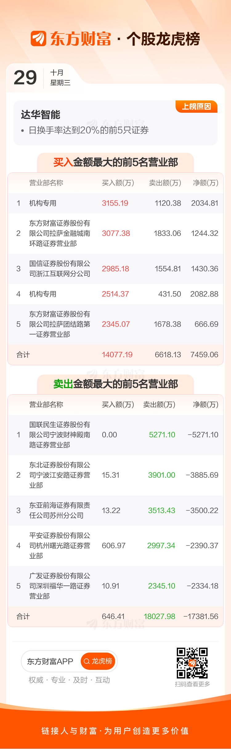 交易所2025年10月29日公布的交易公开信息显示,达华智能因成为日换手率达到20%的前5只证券上榜。达华智能当日收报5.19元,涨跌幅-3.89%,偏离值40.10%,换手率40.10%,成交额23.71亿。