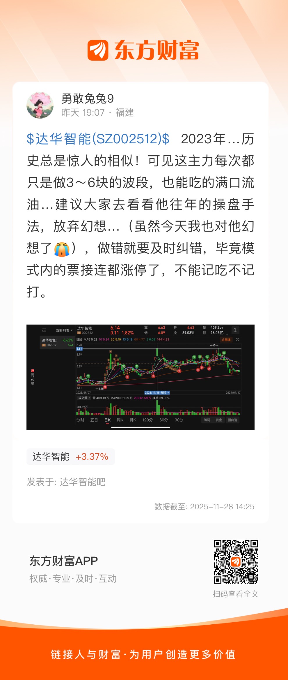 $达华智能(SZ002512)$ 2023年…历史总是惊人的相似!可见这主力每次都只是做3~6块的波段,也能吃的满口流油…建议大家去看看他往年的操盘手法,放弃幻想…(虽然今天我也对他幻想了