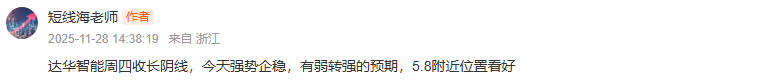 达华智能华智能商业航天+卫星通信热点绑定,手握稀缺K a卫星轨位资源,海事通信市占率超35%,11月多次大额资金净流入,两连板获抢筹。关注度大幅提升!达实智能跟着商业航天板块走活,两连板修复后稳稳站在均线上方调整蓄势,这两天调整下来筹码更扎实了,站上6元大关没多大问题。加上商业航天板块还有持续利好撑着,后续往前高方向冲一冲也有机会。
