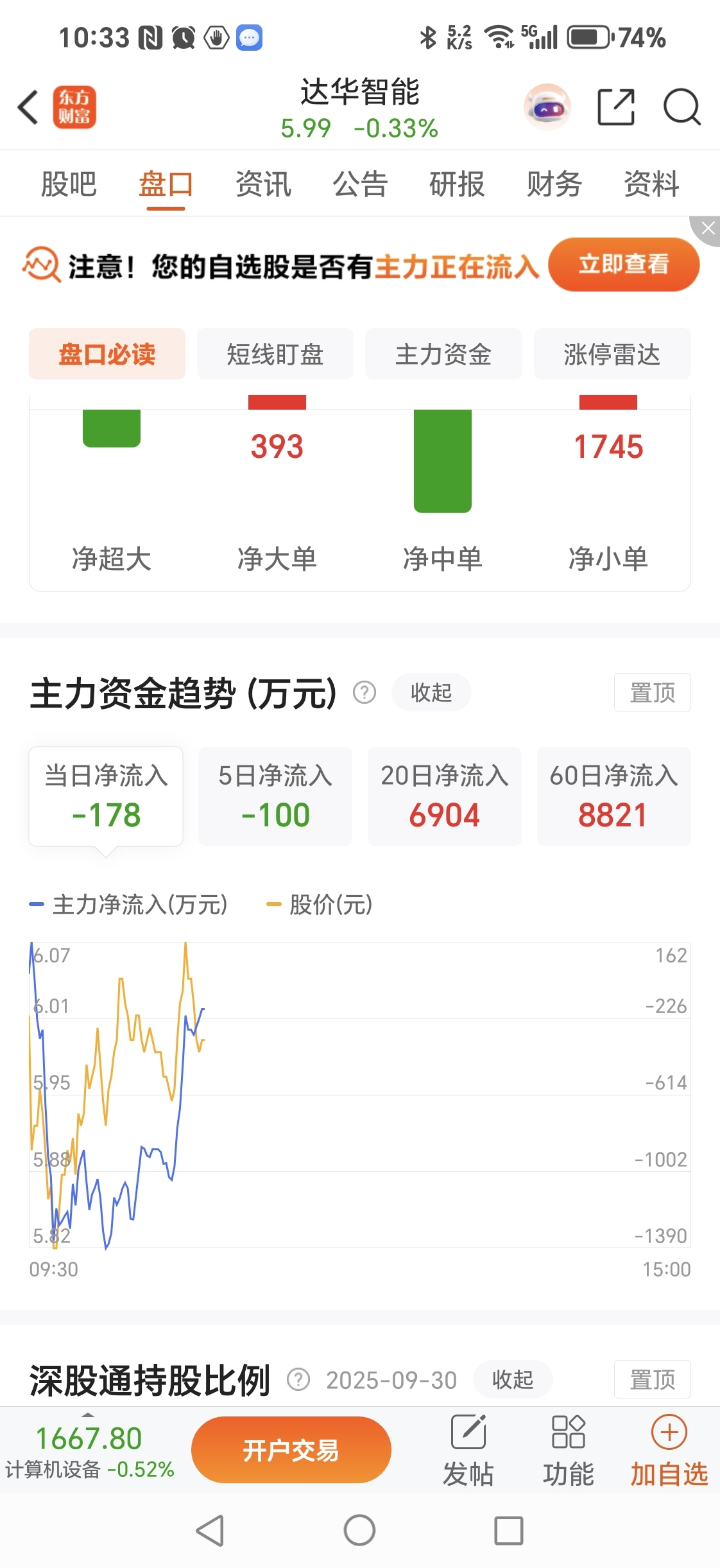 $达华智能(SZ002512)$ 主力资金趋势图线和股价反向,主力在进,但主力太穷,不能快速拉升,散户看不到希望都在卖,股价线往下走,不知道下午会不会强势