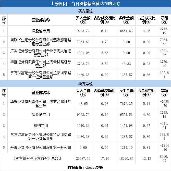 深交所2025年12月9日交易公开信息显示,达华智能因属于当日涨幅偏离值达7%的证券而登上龙虎榜。达华智能当日报收7.84元,涨跌幅为9.96%,偏离值达10.52%,换手率17.63%,振幅4.91%,成交额15.03亿元。