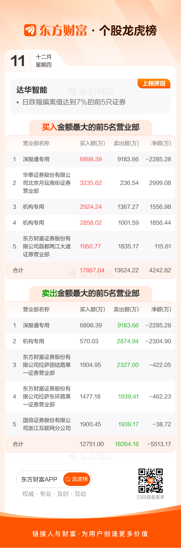 交易所2025年12月11日公布的交易公开信息显示,达华智能因成为日跌幅偏离值达到7%的前5只证券上榜。达华智能当日收报7.24元,涨跌幅-9.95%,偏离值-8.59%,换手率21.82%,成交额17.55亿。