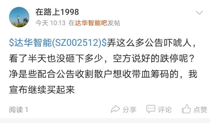温馨提示: 1.根据《证券法》规定,禁止编造、传播虚假信息或者误导性信息,扰乱证券市场;2.用户在本社区发表的所有资料、言论等仅代表个人观点,与本网站立场无关,不对您构成任何投资建议。用户应基于自己的独立判断,自行决定证券投资并承担相应风险。《东方财富社区管理规定》