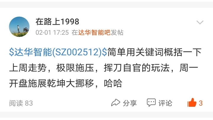 温馨提示: 1.根据《证券法》规定,禁止编造、传播虚假信息或者误导性信息,扰乱证券市场;2.用户在本社区发表的所有资料、言论等仅代表个人观点,与本网站立场无关,不对您构成任何投资建议。用户应基于自己的独立判断,自行决定证券投资并承担相应风险。《东方财富社区管理规定》