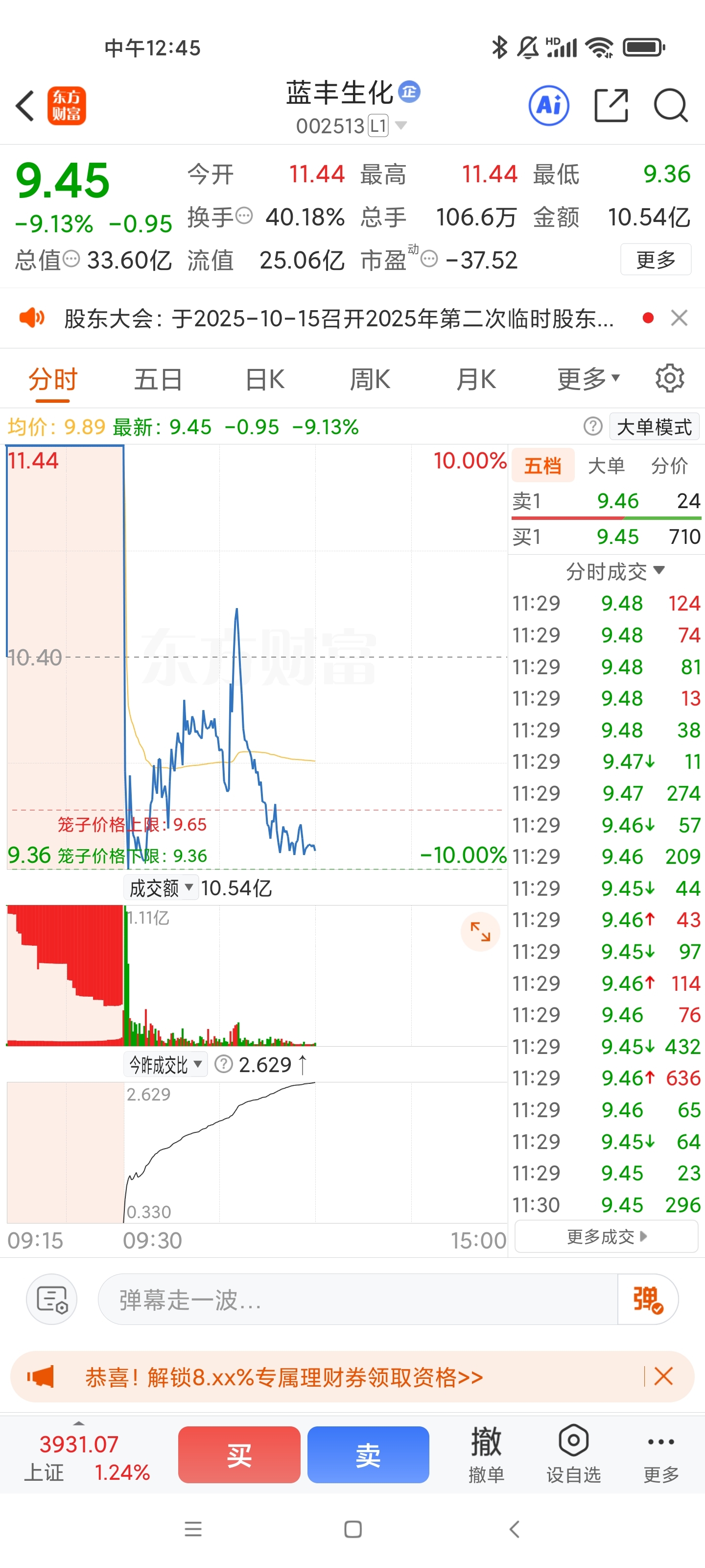 $蓝丰生化(SZ002513)$ 今天11.44还敢买的也是奇葩,看左下角的竞价图,隔夜单数量为0,标准的9:20左右诱多、形成头重脚轻的筹码结构,开盘价太高主力高兴赶紧砸盘卖了、不会有今天11.44买到的人吧。唯一的买点只有在今天下午2:59分尾盘竞价才能看出主力的意图,如果是封住就没戏了,10.9号新龙就出来了。