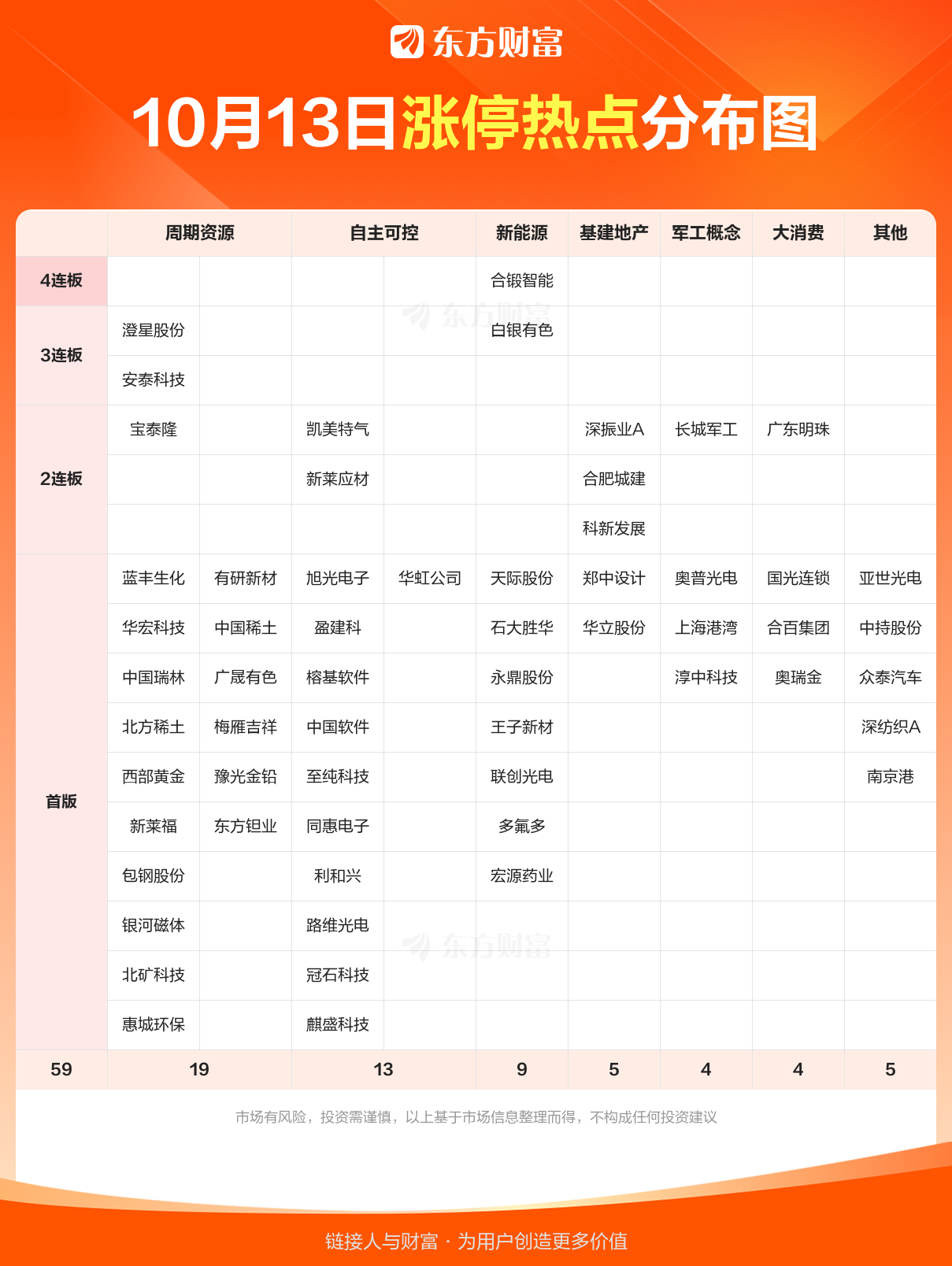 北方稀土:北方稀土发布2025年前三季度业绩预告,预计归属于上市公司股东的净利润为15.1亿元-15.7亿元,同比增加272.54%到287.34%。报告期内,公司紧抓市场变化,强化预算管理与降本增效,科学组织生产,加强市场研判和营销运作,推进重点项目建设和科研创新,主要产品产销量同比增长,推动经营业绩大幅上升。 北方稀土:北方稀土公告称,根据稀土精矿定价方法及2025年第三季度稀土氧化物价格,经测算并经公司总经理办公会审议通过,2025年第四季度稀土精矿交易价格调整为不含税26205元/吨(干量,REO=50%),REO每增减1%、不含税价格增减524.10元/吨。小财注:此前,北方稀土7月10日公告,第三季度稀土精矿交易价格调整为不含税19109元/吨。据此估算,此次价格环比上涨37.13%。 上纬新材:上纬新材公告称,公司股票将于10月13日复牌。此前,公司因股票交易异常波动停牌核查。公司已关注到近期市场存在部分媒体关于上纬新材与实际控制人邓泰华及其控制的智元创新(上海)科技有限公司相关资产进行整合的讨论与报道。公司发函向公司收购人暨控股股东上海智元恒岳科技合伙企业(有限合伙)及实际控制人邓泰华核实,截至目前,收购方智元恒岳及其一致行动人上海致远新创科技设备合伙企业(有限合伙)不存在在未来12个月内对上市公司及其子公司的资产和业务进行出售、合并、与他人合资或合作的明确计划,或上市公司拟购买或置换资产的明确重组计划。截至目前,未来36个月内,智元创新不存在通过上市公司借壳上市的计划或安排。 全志科技:全志科技公告,预计2025年前三季度归属于上市公司股东的净利润为2.6亿元-2.9亿元,同比增长72.20%-92.06%;预计第三季度净利润1亿元-1.3亿元,同比增长213.23%-307.2%。报告期内,受益于下游市场需求持续增长及公司新产品量产,在智能汽车电子、扫地机器人、智能视觉等领域营业收入同比快速增长,带动净利润上升。预计非经常性损益对净利润影响金额为2900万元至3400万元。 广生堂:广生堂公告称,公司创新药控股子公司福建广生中霖生物科技有限公司收到美国肝病研究协会的通知,乙肝治疗一类创新药GST-HG131的临床II期研究结果被正式接受为最新突破摘要口头报告。GST-HG131是全球首个完成II期临床的口服HBsAg抑制剂,具有良好可及性和患者依从性。其II期临床试验显示,HBsAg下降迅速,最高降幅达97.71%。此外,GST-HG131联合GST-HG141针对乙肝经治患者的II期临床试验项目有望挑战乙肝临床治愈。然而,该研究结果被美肝会年会接受仅为对其临床研究成果的认可,尚需完成相关注册性临床研究并经国家药品审评部门审批通过后方可上市。创新药研发存在技术、审批、政策等多方面风险,后续能否获得批准存在不确定性。 中国电建:中国电建公告称,近日,公司下属子公司中国水电建设集团国际工程有限公司、中国电建集团华东勘测设计研究院有限公司与中国电力建设集团有限公司组成联合体,与沙特阿菲夫可再生能源公司签订了沙特阿菲夫1光伏IPP项目及沙特阿菲夫2光伏IPP项目合同,合同金额折合人民币分别约58.43亿元、58.76亿元。两个项目均位于沙特中部地区利雅得省阿菲夫镇,工程范围为:修建2000MW光伏场区、33/132kV场区升压站、132kV送出线路、电网站的部分连接设施和接口设施、连接道路等。合同工期均为26个月。市场消息