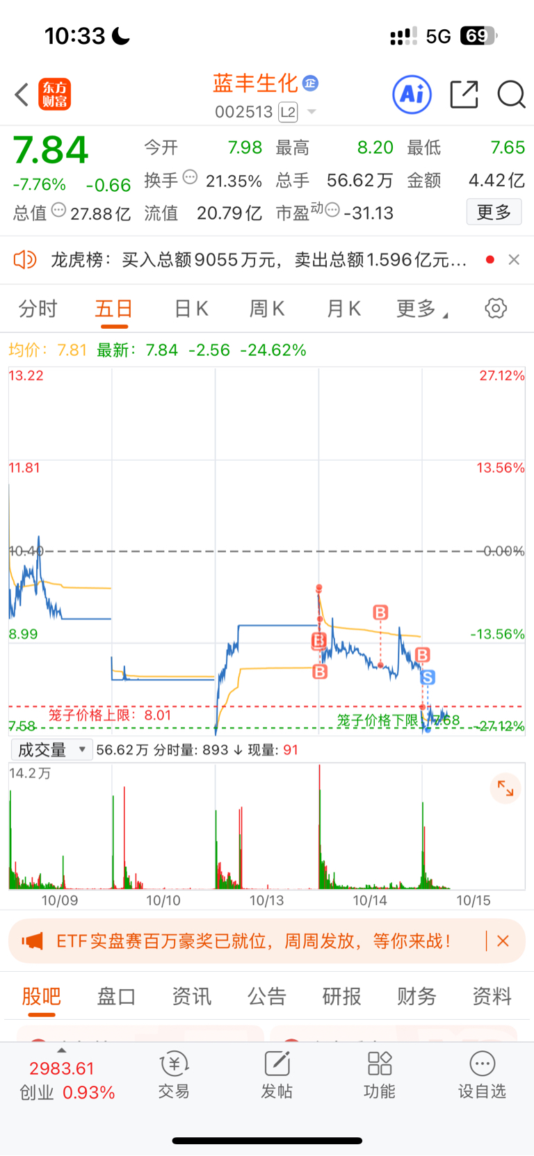 $蓝丰生化(SZ002513)$ 明天竞价走人,亏惨了,又追涨停下来了