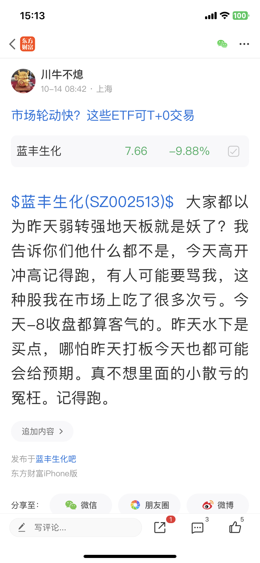$蓝丰生化(SZ002513)$ 昨天我说了,前天打板都可以,昨天冲高就是卖点,这个股昨天跌8个点以上,预判精确,今天是继续核。不要犟,股市专治各种不服