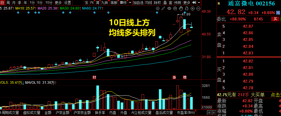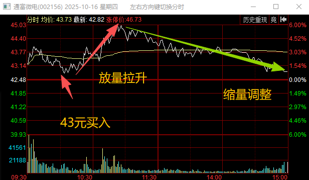在今天早上的盘前策略当中和大家分享了这只标,在文中提到了上午10点股价能在10日线上方就可以入场,我在10点43的价格上车的,股价放量拉升了一波后,冲高回落,缩量走了一波调整,收出了一根长上影线,回到了我上午10点买入价格的附近,这一根冲高回落的长上影线,丛量价关系来看,说明主俚还在试盘,投石问路,测试抛压。股价目前在10日线上方,呈现均线多头排列,继续耐心持股待涨。
