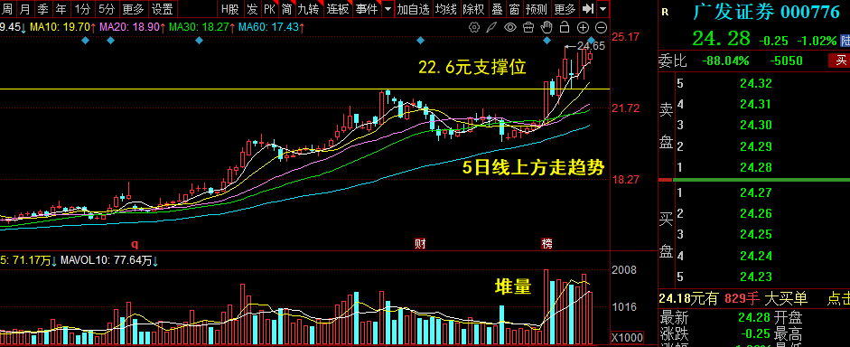 当下的行情,指数要想冲击4000点,券商一定会有所表现,带动指数往上攻,从板块来看没有任何的问题。目前广发股价五日线上方,走趋势行情,下方成交量堆量,主俚紫金还在持续流入,只要5日线不破,都是可以继续拿的,如果跌破5日线,下方22.6还有强支撑位可以加苍。