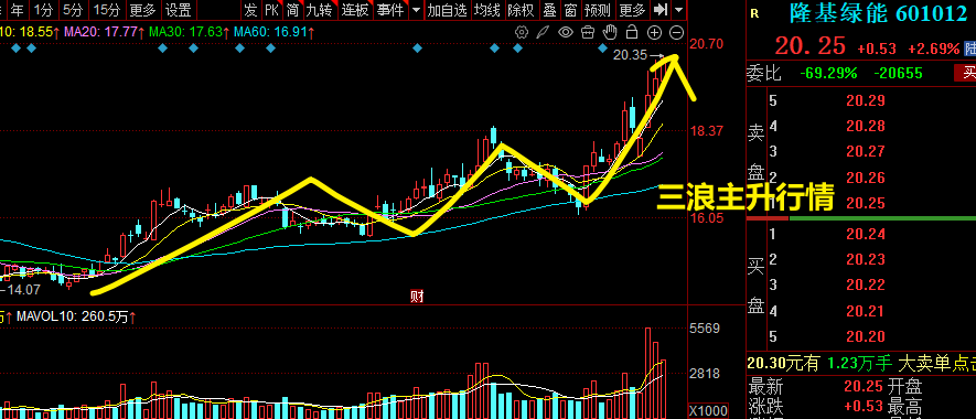 大盘冲高回落,表现的较弱,而隆基全天股价震荡向上,股价持续创新高,连续收出了四跟大阳线,而且连续三天的量能还是缩量的,缩量上涨意味着主俚锁苍拉升,这里的行情正是三浪中的主升行情,和我一起上车的老友,一定要拿稳拿好,抓住这波主升的机会。