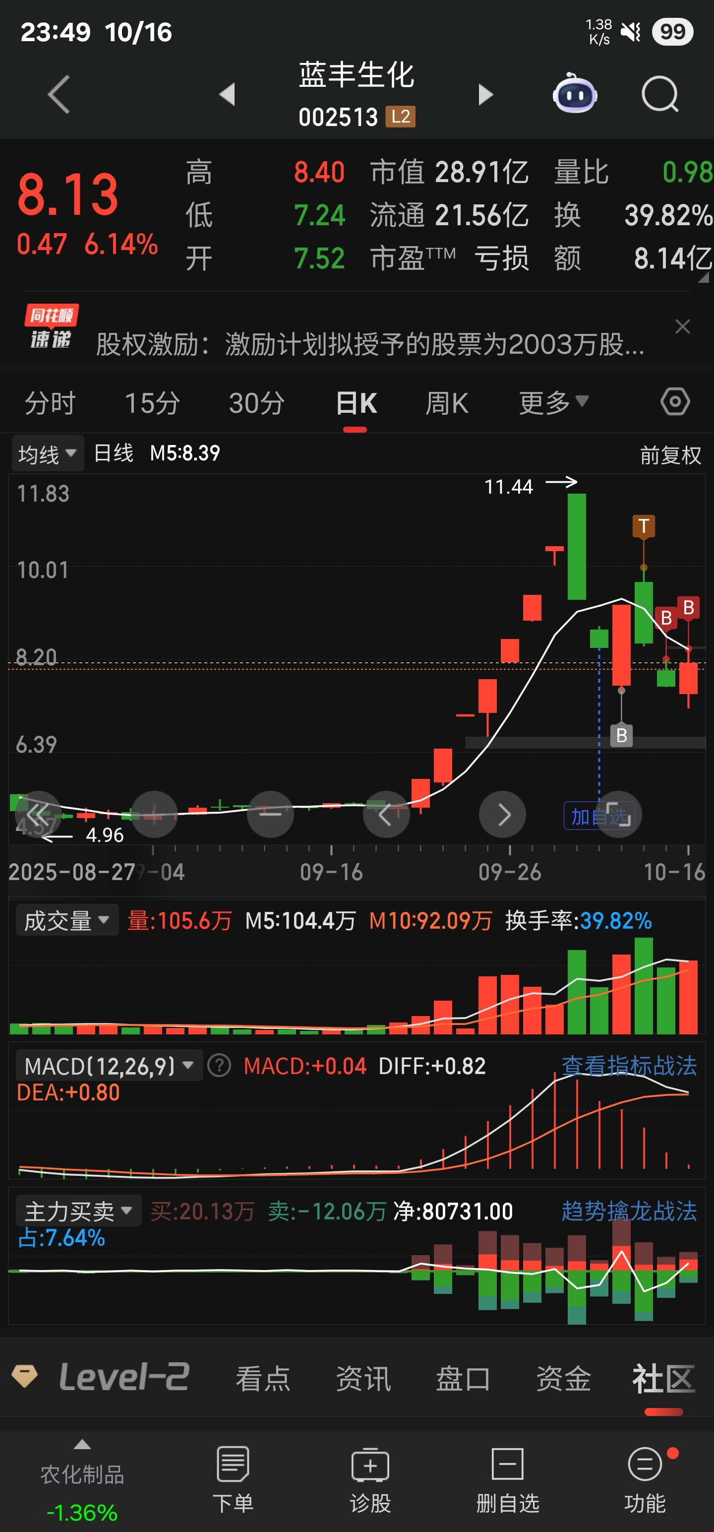$蓝丰生化(SZ002513)$ 故事的一切要从1700股的地天开始说起……